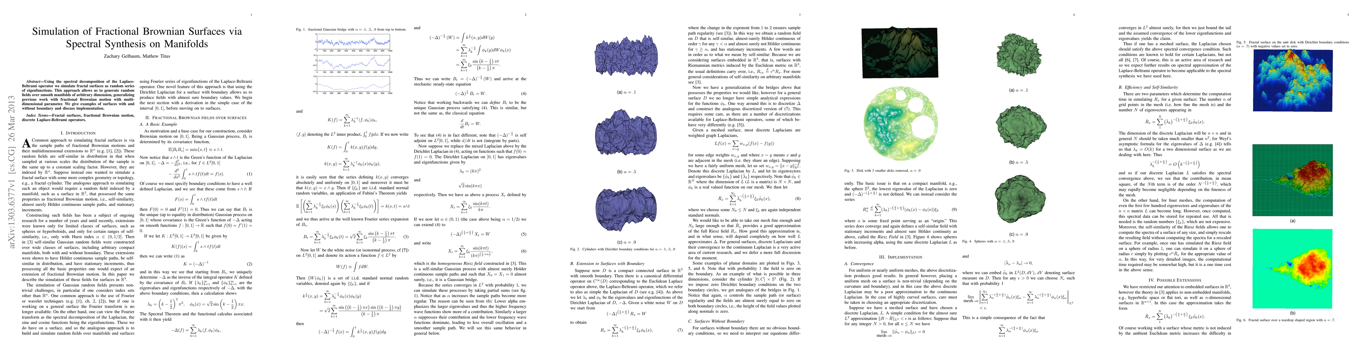 This paper presents a method to simulate fractal surfaces using spectral synthesis on manifolds, based on the Laplace-Beltrami operator's spectral decomposition. The approach enables generation of random fields over smooth surfaces of any dimension, extending prior work on fractional Brownian motion with multi-dimensional parameters. Examples of surfaces with and without boundaries are provided, along with implementation discussion.
