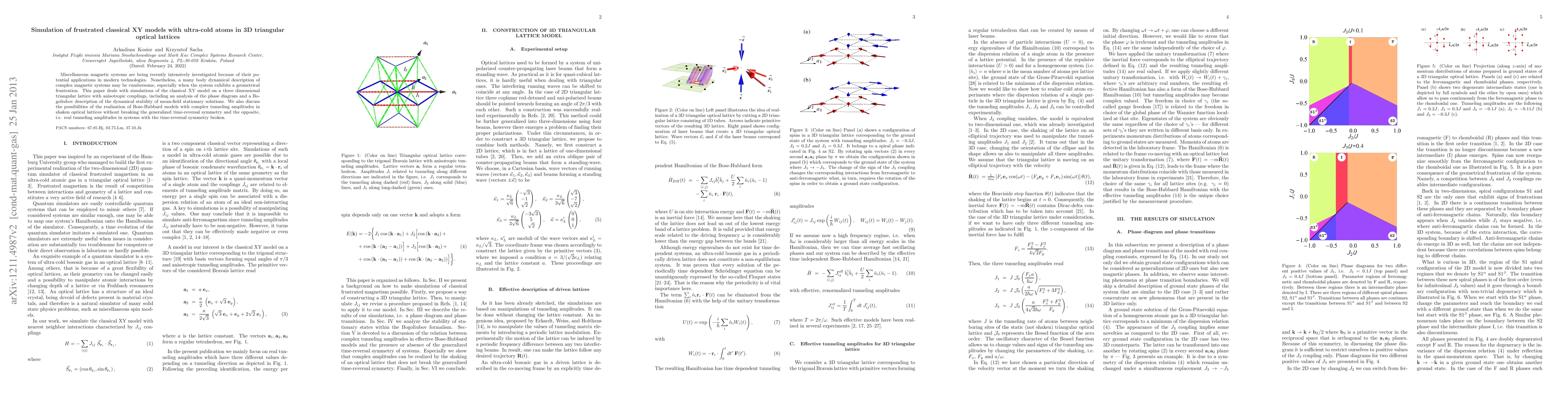This paper simulates the frustrated classical XY model in 3D triangular optical lattices using ultra-cold atoms, analyzing its phase diagram and dynamical stability. It also explores the implementation of Bose-Hubbard models in shaken optical lattices, considering the impact on time-reversal symmetry.