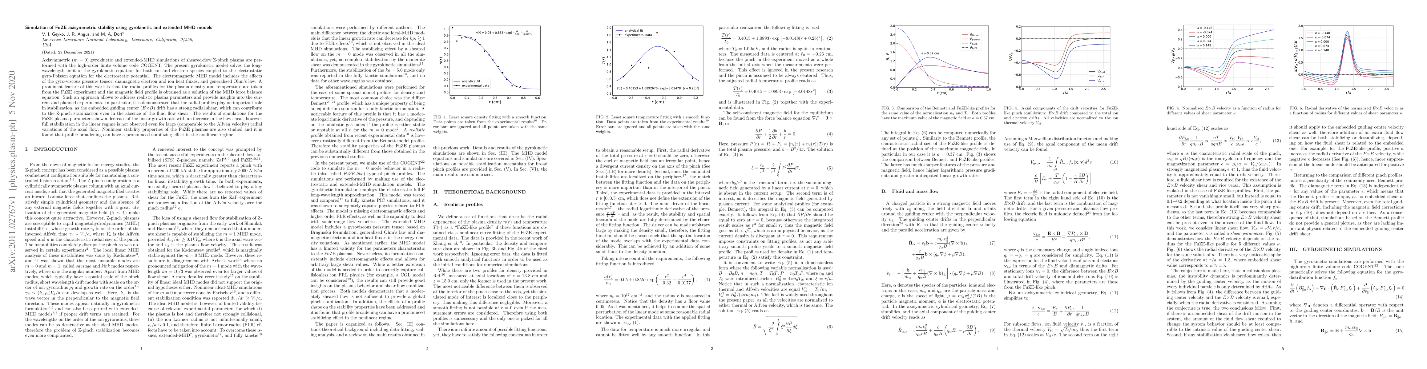 Axisymmetric ($m=0$) gyrokinetic and extended-MHD simulations of sheared-flow Z-pinch plasma are performed with the high-order finite volume code COGENT. The present gyrokinetic model solves the long-wavelength limit of the gyrokinetic equation for both ion and electron species coupled to the electrostatic gyro-Poisson equation for the electrostatic potential. The electromagnetic MHD model includes the effects of the gyro-viscous pressure tensor, diamagnetic electron and ion heat fluxes, and generalized Ohm's law. A prominent feature of this work is that the radial profiles for the plasma density and temperature are taken from the FuZE experiment and the magnetic field profile is obtained as a solution of the MHD force balance equation. Such an approach allows to address realistic plasma parameters and provide insights into the current and planned experiments. In particular, it is demonstrated that the radial profiles play an important role in stabilization, as the embedded guiding center ($E{\times} B$) drift has a strong radial shear, which can contribute to the Z-pinch stabilization even in the absence of the fluid flow shear. The results of simulations for the FuZE plasma parameters show a decrease of the linear growth rate with an increase in the flow shear, however full stabilization in the linear regime is not observed even for large (comparable to the Alfv\'en velocity) radial variations of the axial flow. Nonlinear stability properties of the FuZE plasmas are also studied and it is found that profile broadening can have a pronounced stabilizing effect in the nonlinear regime.