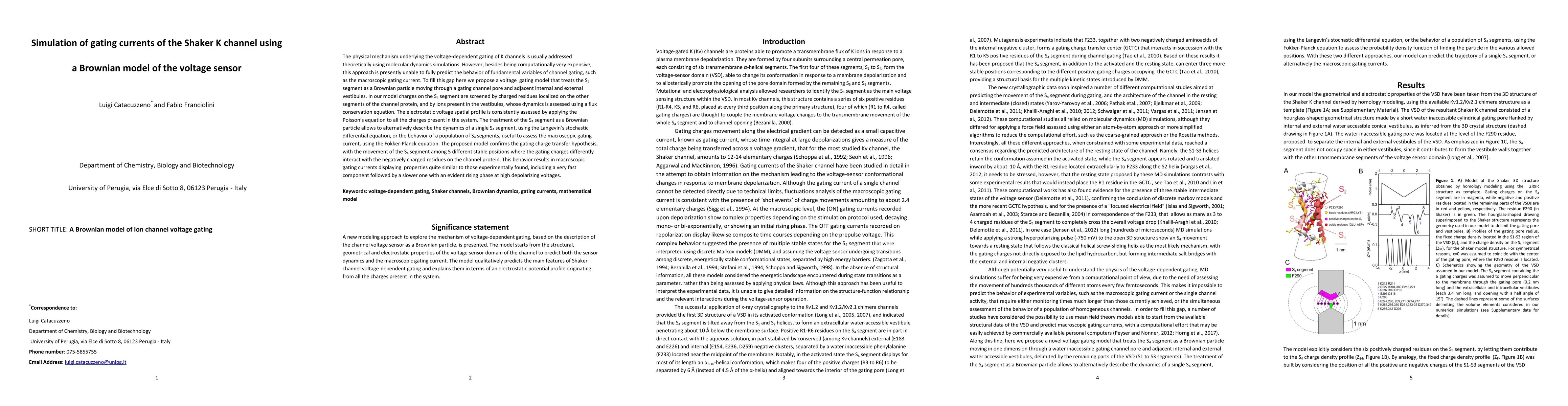 This paper proposes a Brownian model to simulate the gating currents of the Shaker K channel, treating the S4 segment as a stochastic particle. The model accurately predicts the macroscopic gating current, confirming the gating charge transfer hypothesis and reproducing experimental observations.