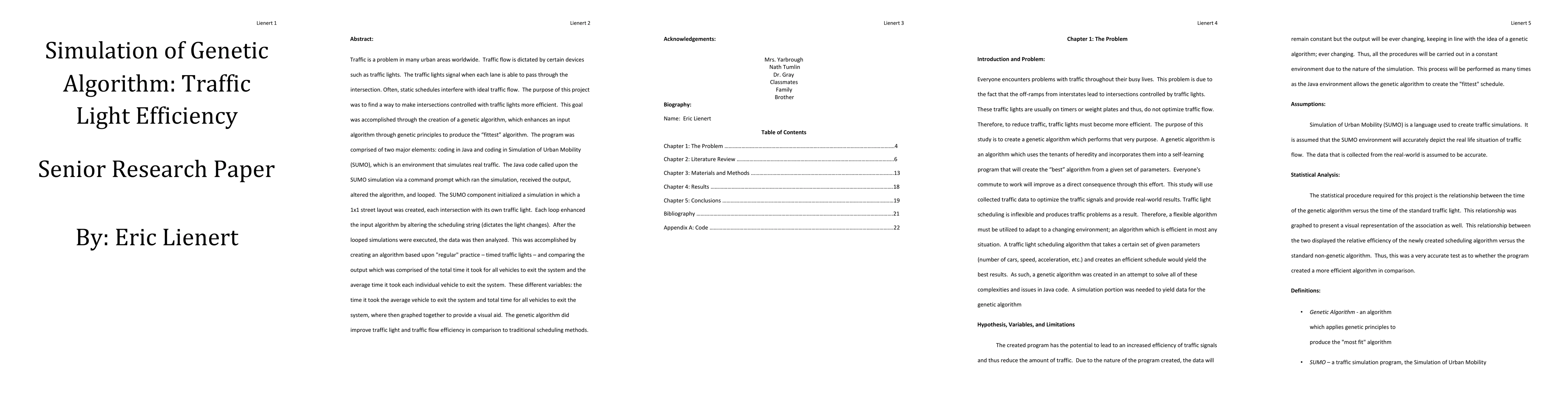 Traffic is a problem in many urban areas worldwide. Traffic flow is dictated by certain devices such as traffic lights. The traffic lights signal when each lane is able to pass through the intersection. Often, static schedules interfere with ideal traffic flow. The purpose of this project was to find a way to make intersections controlled with traffic lights more efficient. This goal was accomplished through the creation of a genetic algorithm, which enhances an input algorithm through genetic principles to produce the fittest algorithm. The program was comprised of two major elements: coding in Java and coding in Simulation of Urban Mobility (SUMO), which is an environment that simulates real traffic. The Java code called upon the SUMO simulation via a command prompt which ran the simulation, received the output, altered the algorithm, and looped. The SUMO component initialized a simulation in which a 1 x 1 street layout was created, each intersection with its own traffic light. Each loop enhanced the input algorithm by altering the scheduling string (dictates the light changes). After the looped simulations were executed, the data was then analyzed. This was accomplished by creating an algorithm based upon regular practice, timed traffic lights, and comparing the output which was comprised of the total time it took for all vehicles to exit the system and the average time it took each individual vehicle to exit the system. These different variables: the time it took the average vehicle to exit the system and total time for all vehicles to exit the system, where then graphed together to provide a visual aid. The genetic algorithm did improve traffic light and traffic flow efficiency in comparison to traditional scheduling methods.