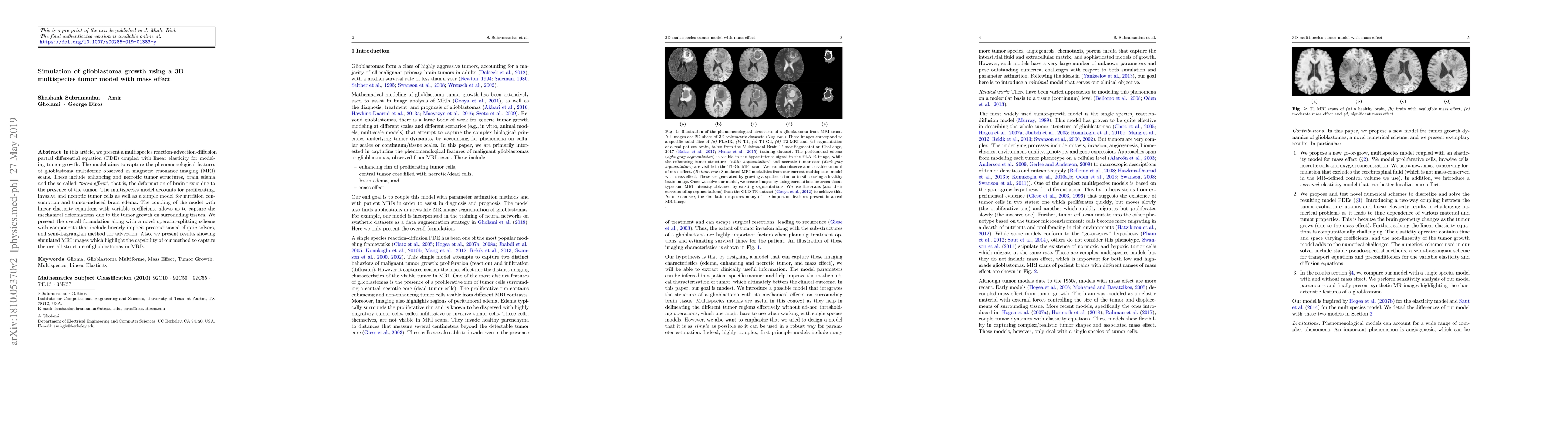 This paper develops a 3D multispecies PDE model to simulate glioblastoma growth, incorporating reaction-advection-diffusion, linear elasticity, and tumor-induced brain edema. The model's operator-splitting scheme and novel solvers enable accurate simulation of MRI-observed features and mechanical deformations due to the tumor's mass effect.