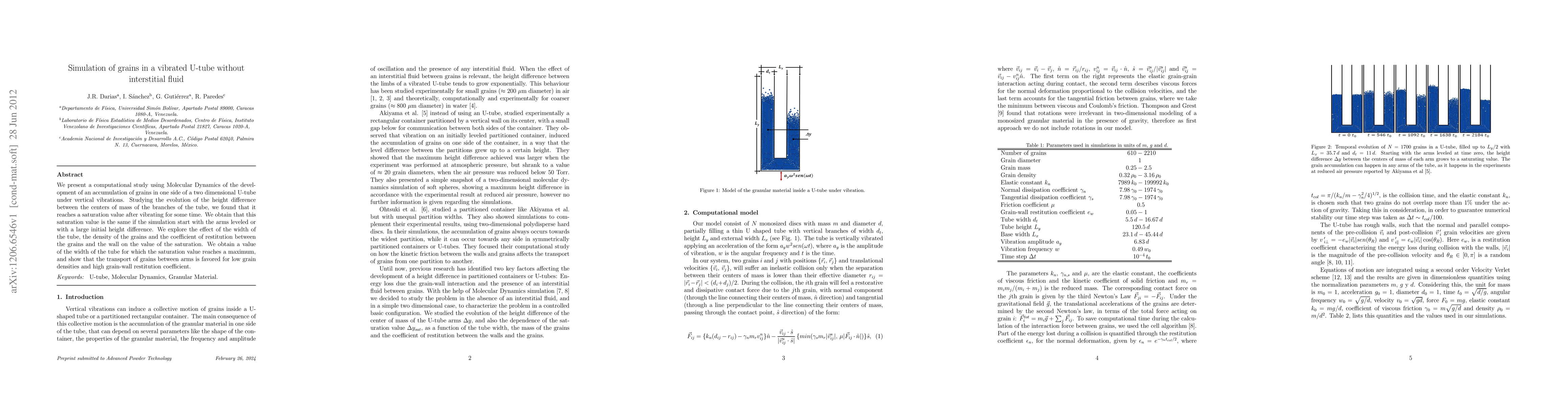 Researchers simulated grain accumulation in a vibrating U-tube and found that it reaches a saturation point after some time, which is influenced by tube width, grain density, and grain-wall interaction.