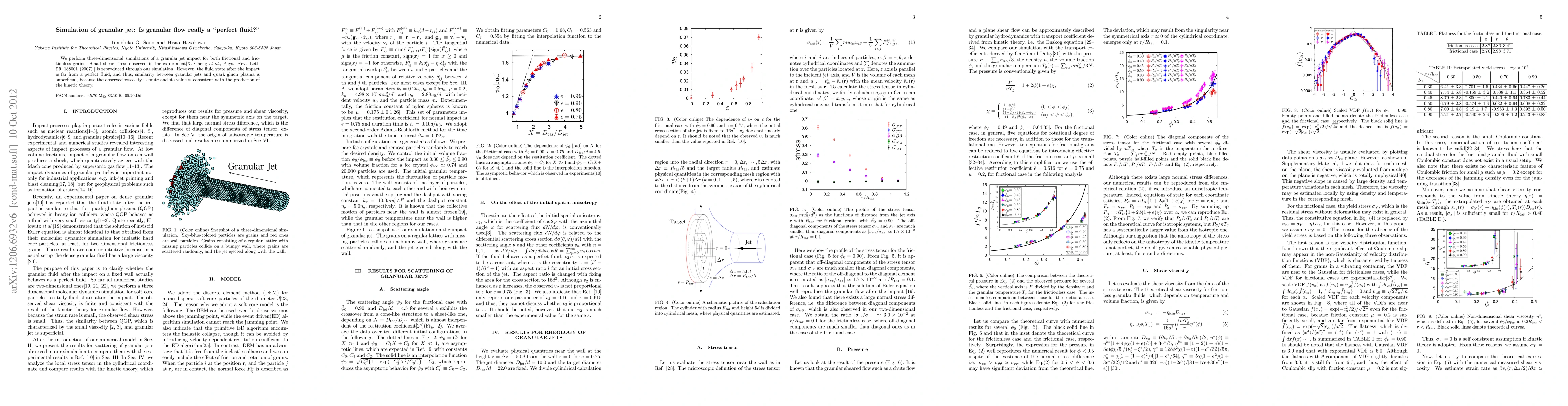 This paper simulates granular jet impacts for both frictional and frictionless grains, finding small shear stress but concluding that the post-impact granular flow is not a "perfect fluid" due to finite viscosity, challenging the similarity to quark gluon plasma.