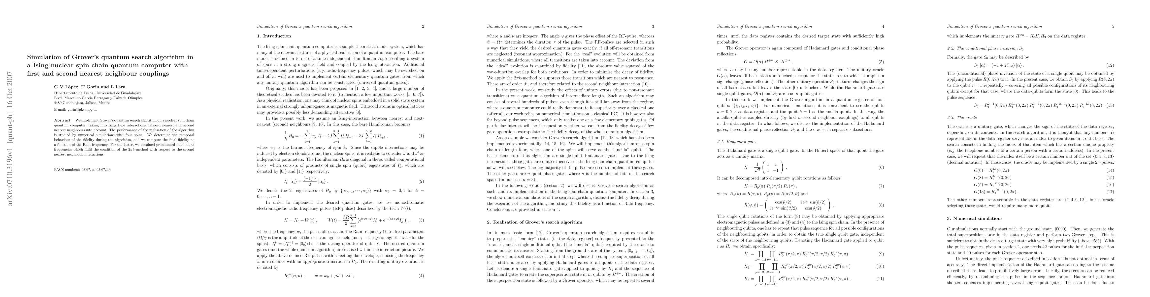We implement Grover's quantum search algorithm on a nuclear spin chain quantum computer, taking into Ising type interactions between nearest and second nearest neighbours into account. The performance of the realisation of the algorithm is studied by numerical simulations with four spins. We determine the temporal behaviour of the fidelity during the algorithm, and we compute the final fidelity as a function of the Rabi frequency. For the latter, we obtained pronounced maxima at frequencies which fulfil the condition of the (2\pi k)-method with respect to the second nearest neighbour interactions.