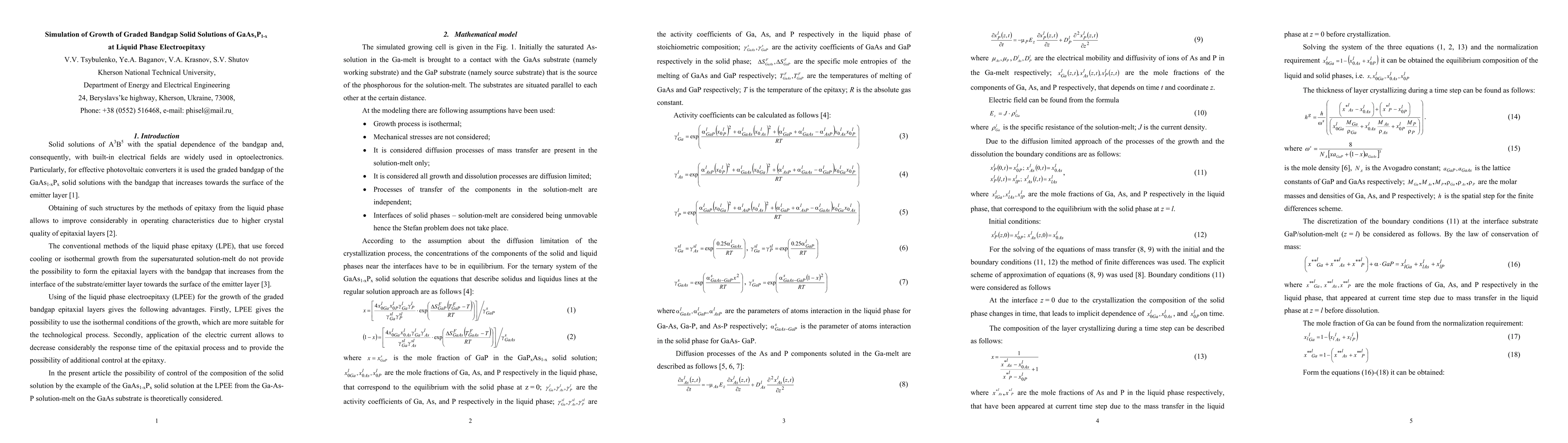 The possibility of the composition control of the GaAs1-xPx solid solution on the GaAs substrate at liquid phase electroepitaxy from the Ga-As-P solution-melt is theoretically considered. By the simulation it was determined, that under steady-state conditions specifying such parameters of the process as the temperature and/or the thickness of the growth space it is possible to obtain graded bandgap layers of the GaAs1-xPx solid solution with increasing of the content of P towards the surface of the layer that possess the composition gradient from 0.5x10-4 mole fraction/nm to 2.0x10-3 mole fraction/nm. It was also shown that control of the composition of ternary solid solutions at liquid phase electroepitaxy can be realized by use of unsteady state electric field.
