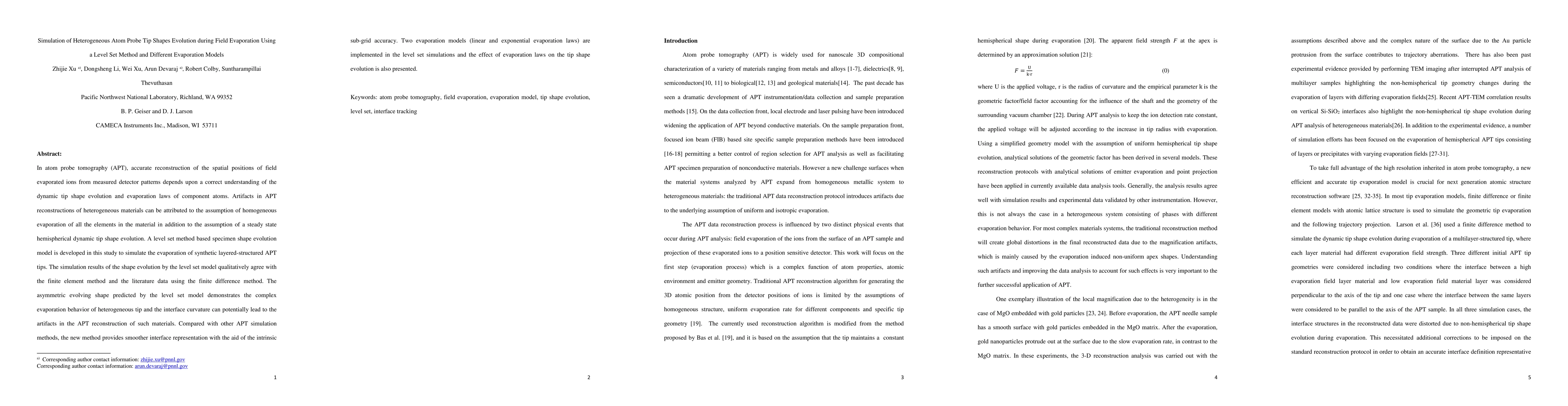 This paper develops a level set method to simulate the dynamic evolution of heterogeneous atom probe tip shapes during field evaporation, comparing linear and exponential evaporation models. The results show complex, asymmetric tip shapes that can lead to artifacts in APT reconstructions, offering a more accurate representation than previous methods.