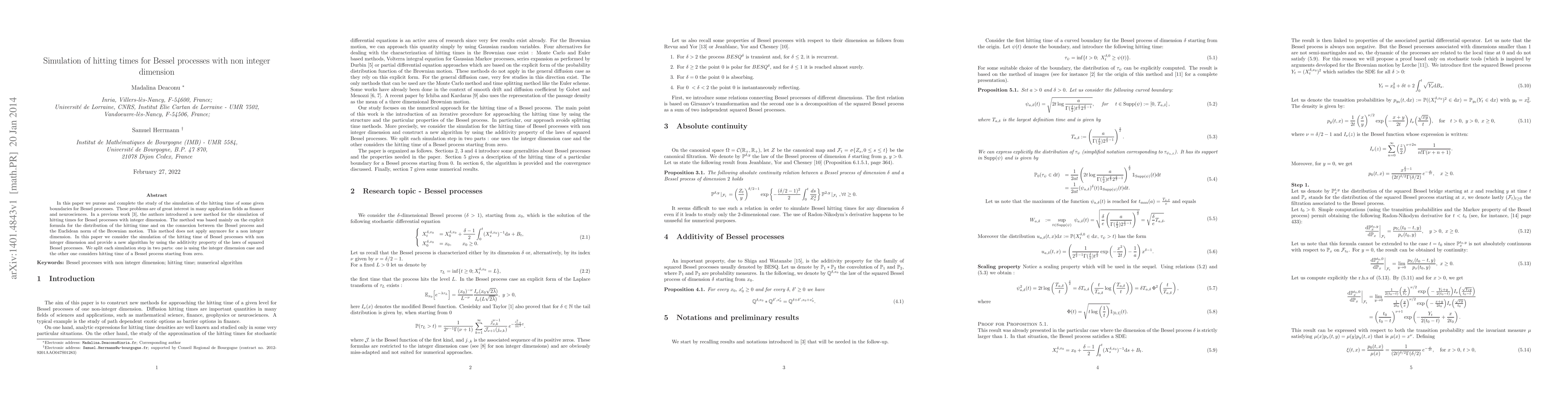 The paper introduces a new algorithm for simulating hitting times of Bessel processes with non-integer dimensions, utilizing the additivity property of the laws of squared Bessel processes and splitting each simulation step into integer and non-integer dimension cases.