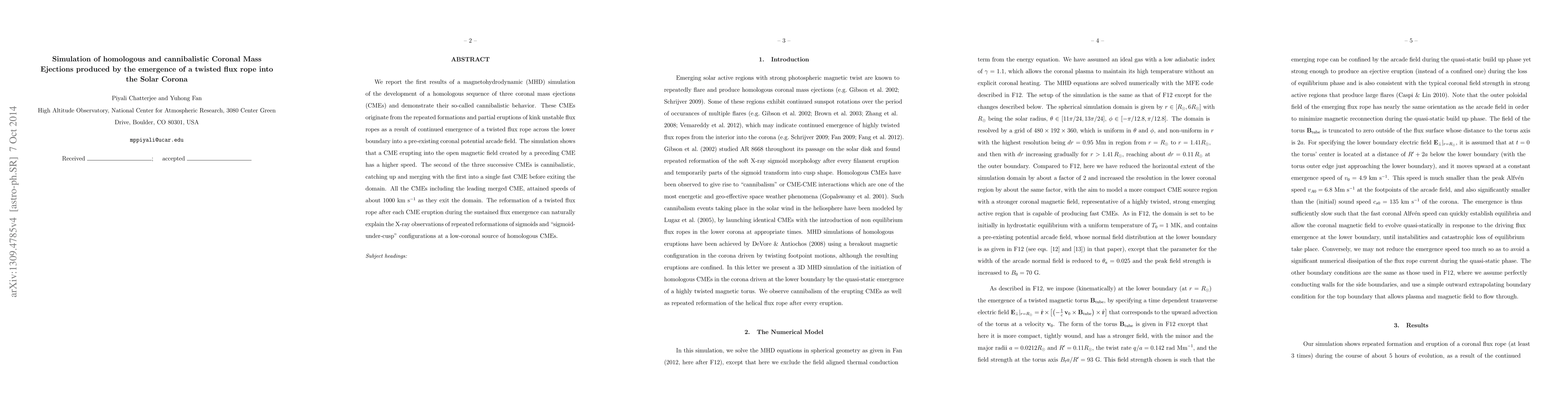 This paper presents MHD simulations of a sequence of three coronal mass ejections (CMEs) originating from the emergence of a twisted flux rope, demonstrating their cannibalistic behavior where later CMEs catch up and merge with preceding ones. The simulation reveals that successive CMEs attain speeds of around 1000 km/s and explains the reformation of sigmoid structures observed in the low corona.