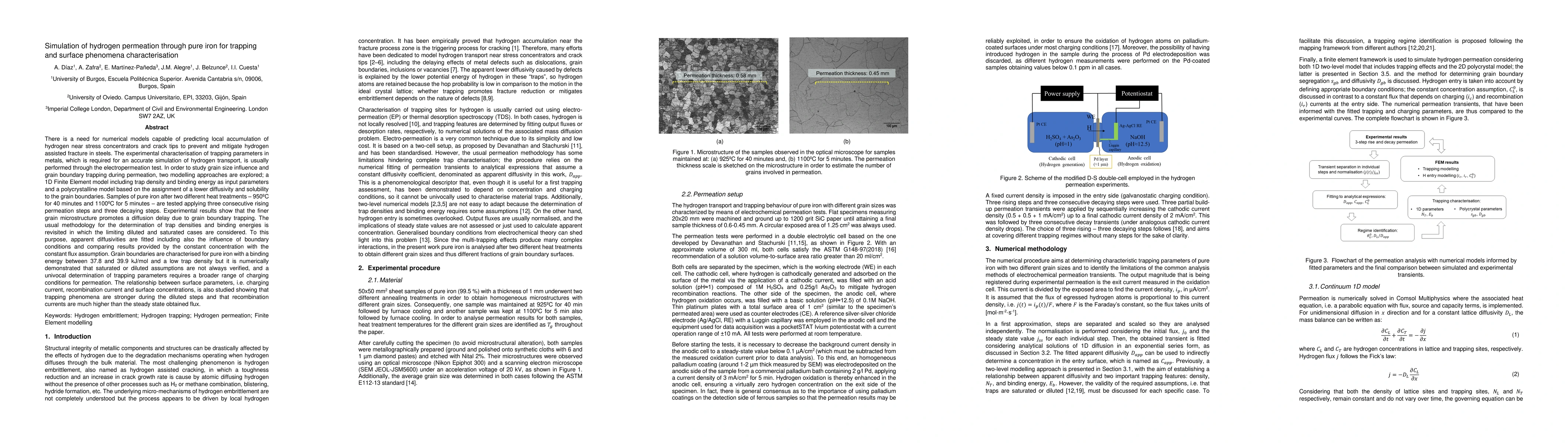 Researchers developed a model to study hydrogen permeation through pure iron, finding that finer grain microstructures can trap hydrogen, delaying its diffusion. The study highlights the need for more charging conditions to accurately determine trapping parameters.