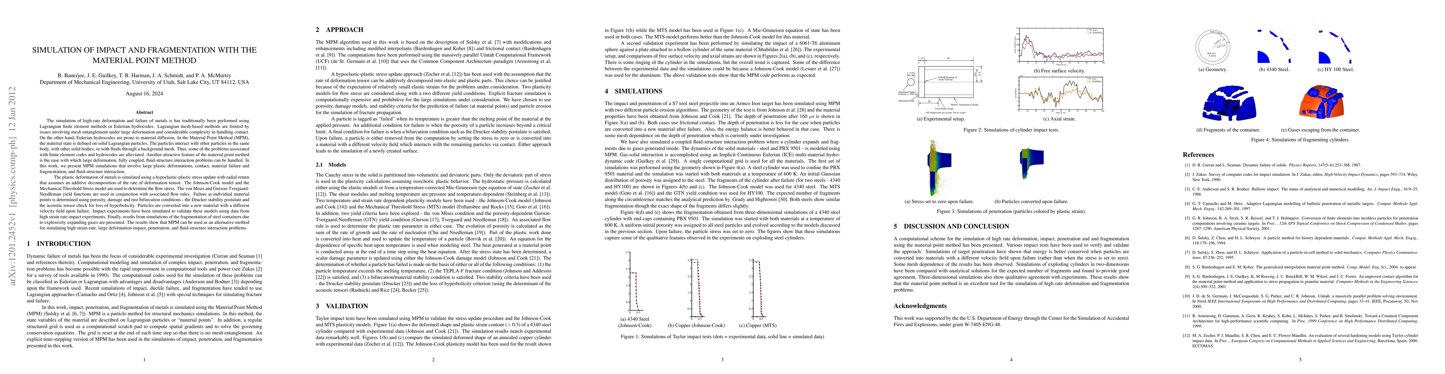 This paper presents simulations using the Material Point Method (MPM) to model high-rate deformation, failure, and fragmentation of metals, addressing limitations of traditional Lagrangian and Eulerian methods by employing solid particles interacting through a background mesh. The MPM effectively handles large deformations, contact, and fluid-structure interactions.