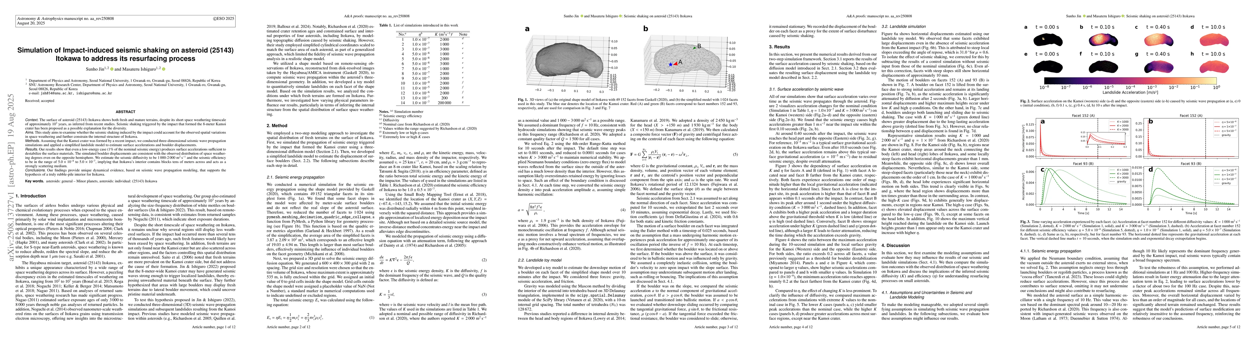 The surface of asteroid (25143) Itokawa shows both fresh and mature terrains, despite its short space weathering timescale of approximately 1000 years, as inferred from recent studies. Seismic shaking triggered by the impact that formed the 8-meter Kamoi crater has been proposed as a possible explanation for the diversity. This study aims to examine whether the seismic shaking induced by the impact could account for the observed spatial variations in space weathering and further constrain the internal structure of Itokawa. Assuming that the Kamoi crater was formed by a recent impact, we conducted three-dimensional seismic wave propagation simulations and applied a simplified landslide model to estimate surface accelerations and boulder displacements. Our results show that even a low-energy case (1 % of the nominal seismic energy) produces surface accelerations sufficient to destabilize the surface materials. The simulated boulder displacements are consistent with the observed distribution of space weathering degrees even on the opposite hemisphere. We estimate the seismic diffusivity to be 1000-2000 m2 s-1 and the seismic efficiency to be in the range of 5.0 x 10-8 to 5.0 x 10-7, implying that Itokawa's interior contains blocks tens of meters across and acts as a strongly scattering medium.