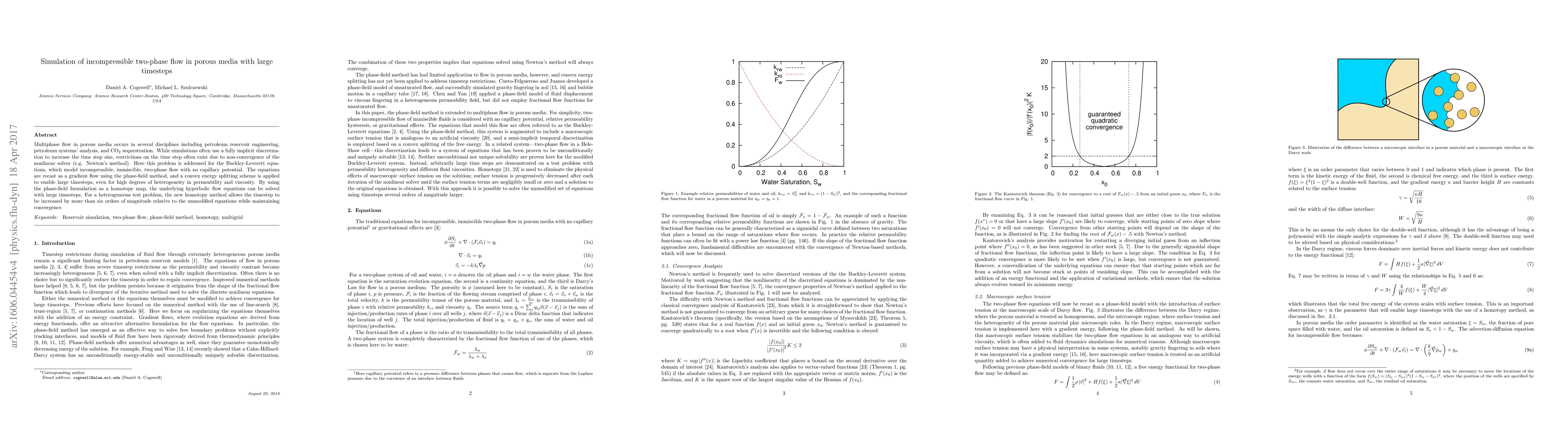 This paper proposes a phase-field method and convex energy splitting scheme to simulate incompressible two-phase flow in porous media, enabling large timesteps and overcoming convergence issues in traditional nonlinear solvers. The method allows timestep increases by over six orders of magnitude for heterogeneous permeability and viscosity scenarios.