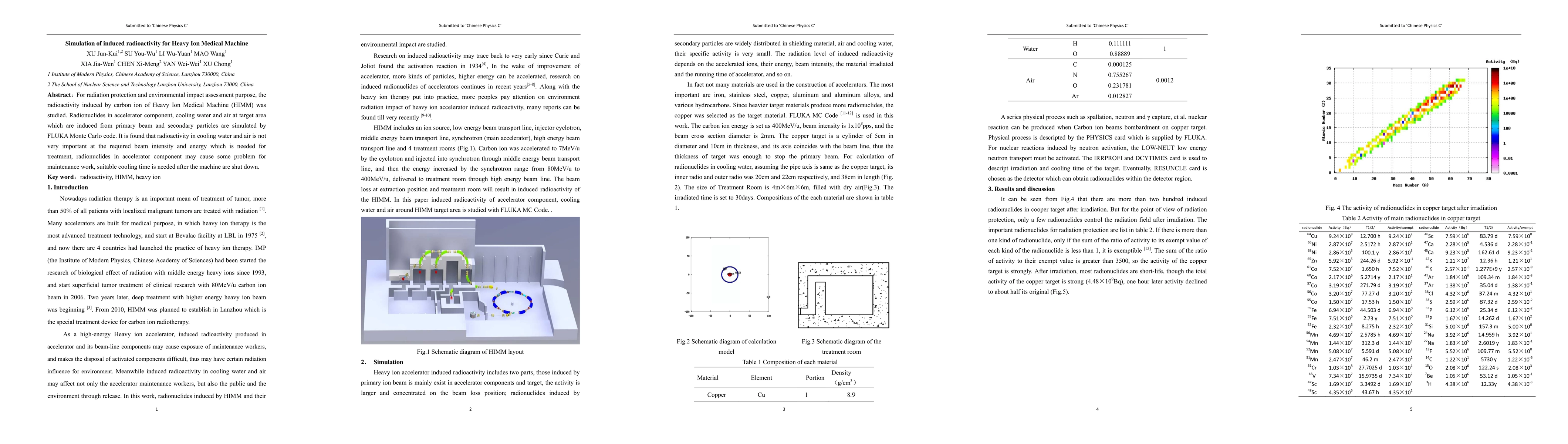 For radiation protection and environmental impact assessment purpose, the radioactivity induced by carbon ion of Heavy Ion Medical Machine (HIMM) was studied. Radionuclides in accelerator component, cooling water and air at target area which are induced from primary beam and secondary particles are simulated by FLUKA Monte Carlo code. It is found that radioactivity in cooling water and air is not very important at the required beam intensity and energy which is needed for treatment, radionuclides in accelerator component may cause some problem for maintenance work, suitable cooling time is needed after the machine are shut down.