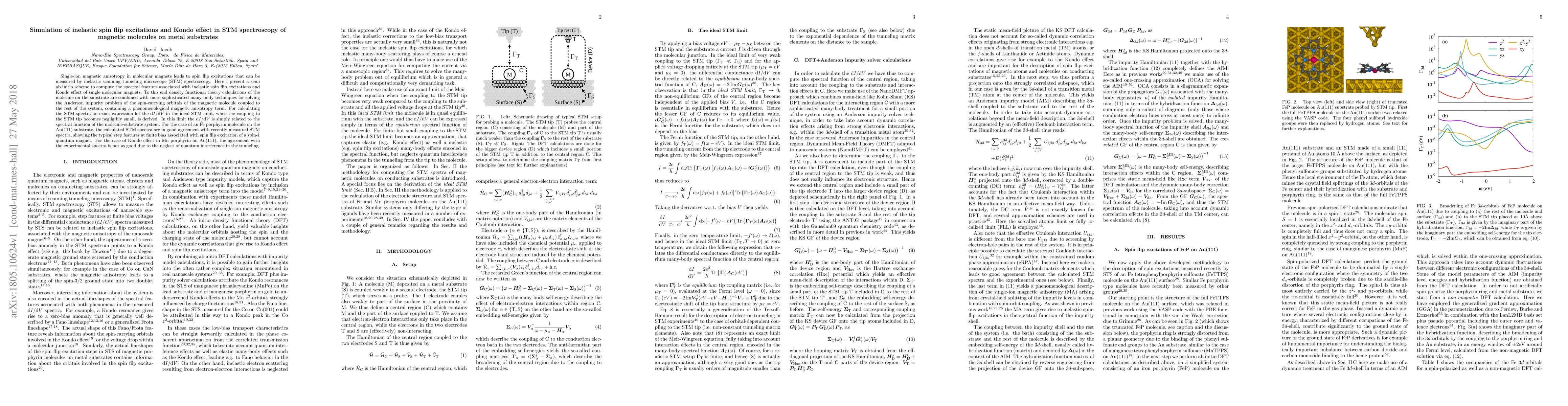 Single-ion magnetic anisotropy in molecular magnets leads to spin flip excitations that can be measured by inelastic scanning tunneling microscope (STM) spectroscopy. Here I present a semi ab initio scheme to compute the spectral features associated with inelastic spin flip excitations and Kondo effect of single molecular magnets. To this end density functional theory calculations of the molecule on the substrate are combined with more sophisticated many-body techniques for solving the Anderson impurity problem of the spin-carrying orbitals of the magnetic molecule coupled to the rest of the system, containing a phenomenological magnetic anisotropy term. For calculating the STM spectra an exact expression for the dI/dV in the ideal STM limit, when the coupling to the STM tip becomes negligibly small, is derived. In this limit the dI/dV is simply related to the spectral function of the molecule-substrate system. For the case of an Fe porphyrin molecule on the Au(111) substrate, the calculated STM spectra are in good agreement with recently measured STM spectra, showing the typical step features at finite bias associated with spin flip excitation of a spin-1 quantum magnet. For the case of Kondo effect in Mn porphyrin on Au(111), the agreement with the experimental spectra is not as good due to the neglect of quantum interference in the tunneling.