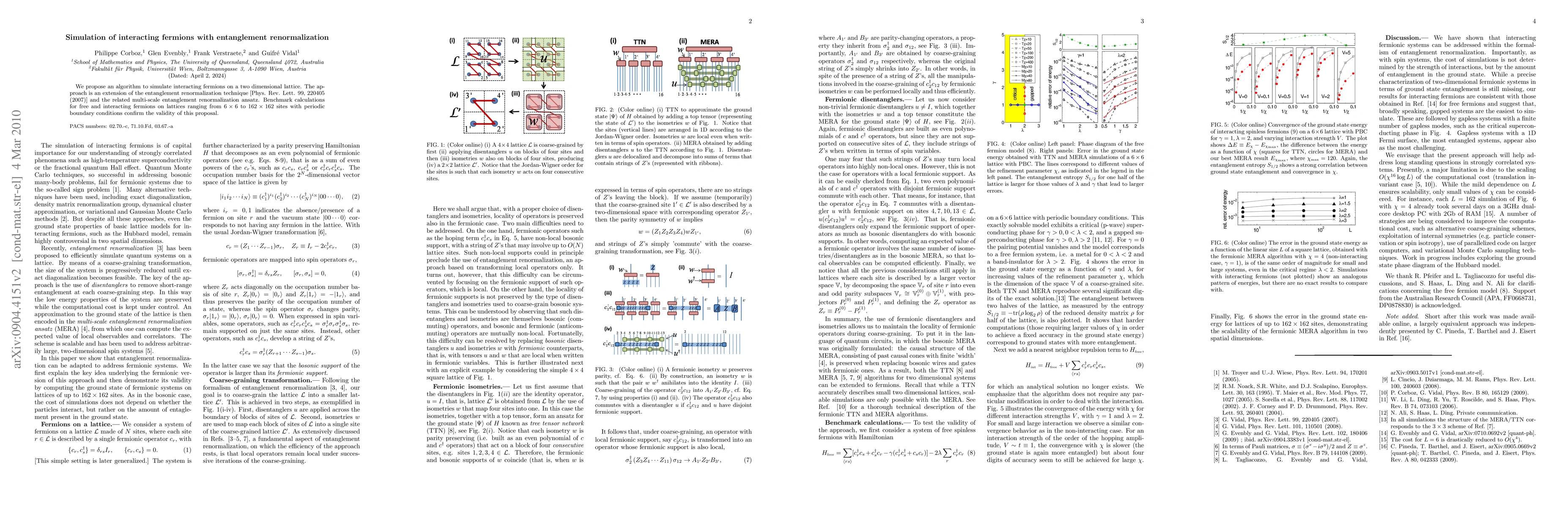This paper proposes an algorithm to simulate interacting fermions on a two-dimensional lattice using an extended entanglement renormalization technique. Benchmark calculations on a $6\times 6$ lattice validate the effectiveness of the proposed method.