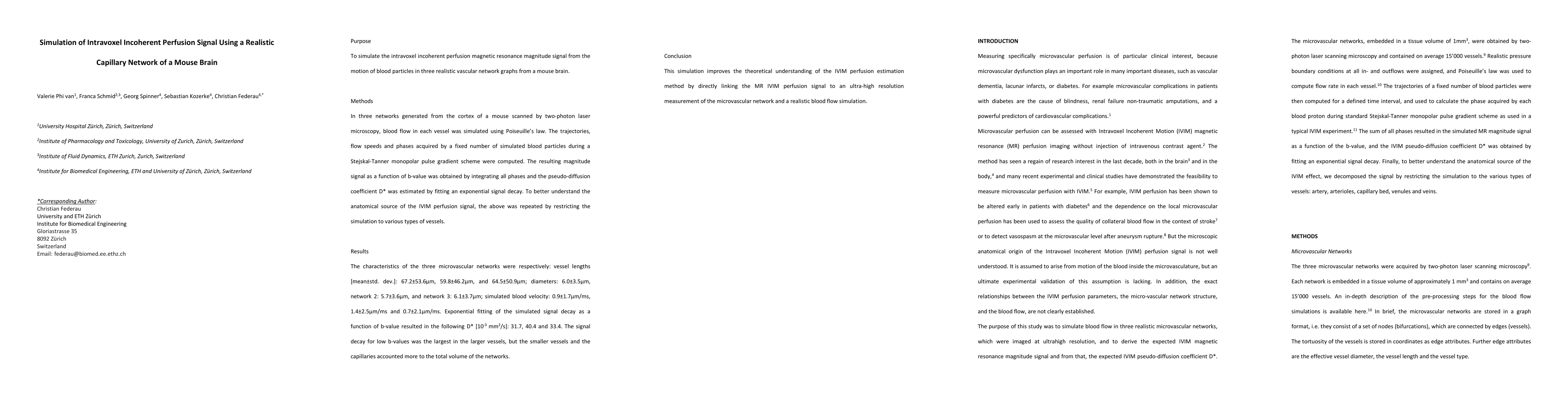 Purpose: To simulate the intravoxel incoherent perfusion magnetic resonance magnitude signal from the motion of blood particles in three realistic vascular network graphs from a mouse brain. Methods: In three networks generated from the cortex of a mouse scanned by two-photon laser microscopy, blood flow in each vessel was simulated using Poiseuille law. The trajectories, flow speeds and phases acquired by a fixed number of simulated blood particles during a Stejskal-Tanner monopolar pulse gradient scheme were computed. The resulting magnitude signal as a function of b-value was obtained by integrating all phases and the pseudo-diffusion coefficient D* was estimated by fitting an exponential signal decay. To better understand the anatomical source of the IVIM perfusion signal, the above was repeated by restricting the simulation to various types of vessels. Results: The characteristics of the three microvascular networks were respectively: vessel lengths [mean +/- std. dev.]: 67.2 +/- 53.6 um, 59.8 +/- 46.2 um, and 64.5 +/- 50.9 um; diameters: 6.0 +/- 3.5 um, network 2: 5.7 +/- 3.6 um, and network 3: 6.1 +/- 3.7 um; simulated blood velocity: 0.9 +/- 1.7 um/ms, 1.4 +/- 2.5 um/ms and 0.7 +/- 2.1 um/ms. Exponential fitting of the simulated signal decay as a function of b-value resulted in the following D* [10-3 mm2/s]: 31.7, 40.4 and 33.4. The signal decay for low b-values was the largest in the larger vessels, but the smaller vessels and the capillaries accounted more to the total volume of the networks. Conclusion:This simulation improves the theoretical understanding of the IVIM perfusion estimation method by directly linking the MR IVIM perfusion signal to an ultra-high resolution measurement of the microvascular network and a realistic blood flow simulation.