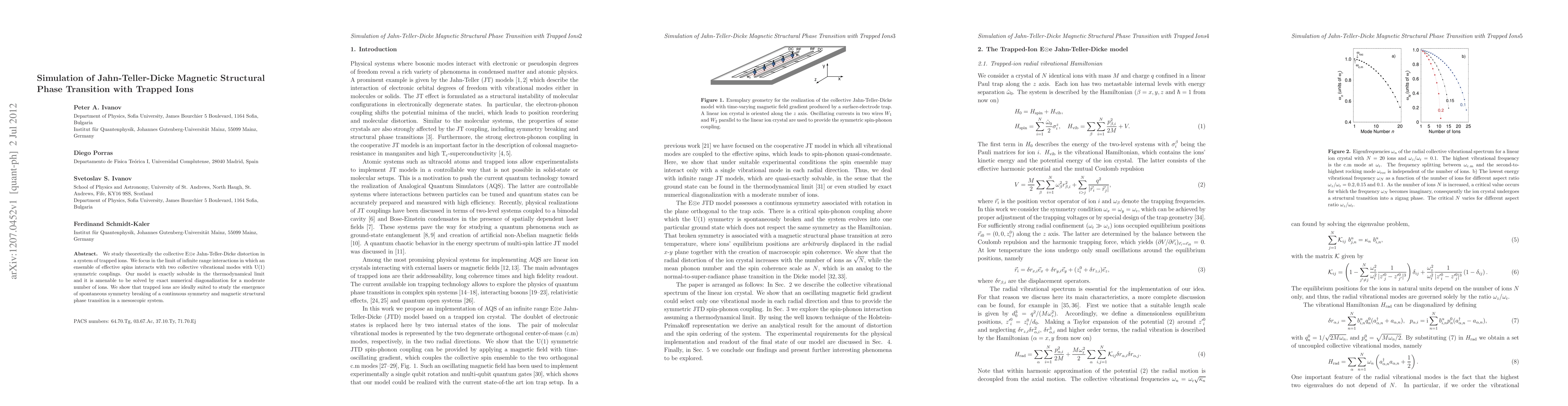This paper theoretically explores the collective Jahn-Teller-Dicke distortion in trapped ions, focusing on infinite range interactions between effective spins and vibrational modes. The model is exactly solvable and demonstrates the suitability of trapped ions for studying spontaneous symmetry breaking and magnetic structural phase transitions in mesoscopic systems.