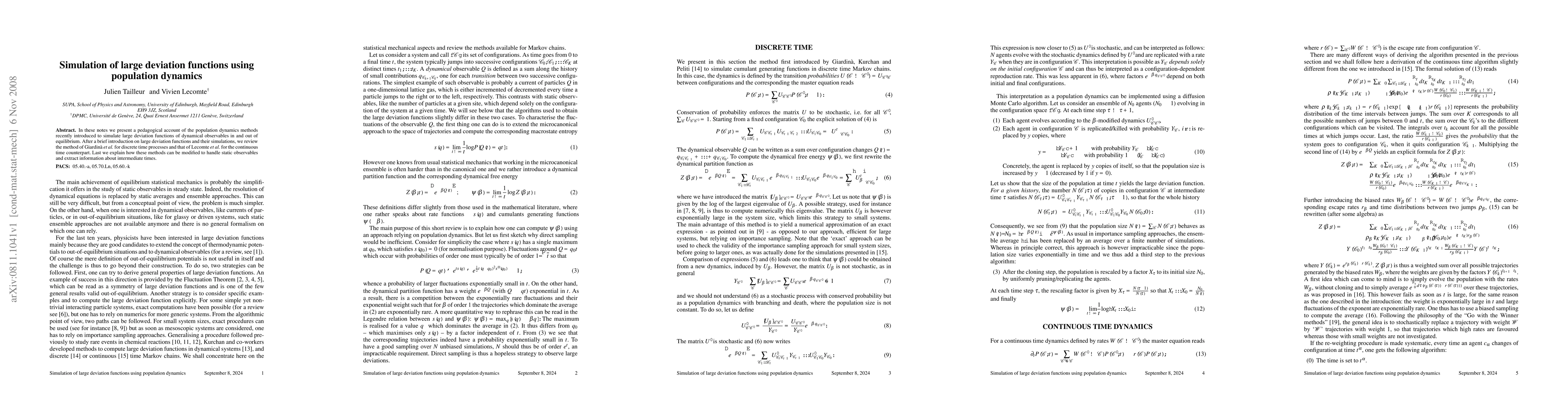 In these notes we present a pedagogical account of the population dynamics methods recently introduced to simulate large deviation functions of dynamical observables in and out of equilibrium. After a brief introduction on large deviation functions and their simulations, we review the method of Giardin\`a \emph{et al.} for discrete time processes and that of Lecomte \emph{et al.} for the continuous time counterpart. Last we explain how these methods can be modified to handle static observables and extract information about intermediate times.
