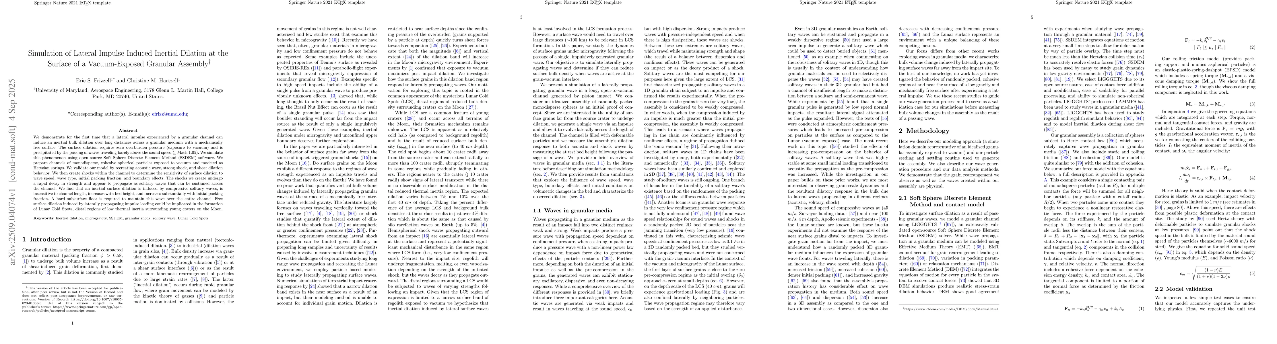 We demonstrate for the first time that a lateral impulse experienced by a granular channel can induce an inertial bulk dilation over long distances across a granular medium with a mechanically free surface. The surface dilation requires zero overburden pressure (exposure to vacuum) and is precipitated by the passing of waves traveling barely above the sound speed (> Mach 1.05). We simulate this phenomenon using open source Soft Sphere Discrete Element Method (SSDEM) software. We prepare channels of monodisperse, cohesive spherical particles exposed to vacuum and modeled as Hertzian springs. We validate our model by recreating acoustic wave, strong shock, and shear dilation behavior. We then create shocks within the channel to determine the sensitivity of surface dilation to wave speed, wave type, initial packing fraction, and boundary effects. The shocks we create undergo a rapid decay in strength and appear to propagate as solitary waves that can be sustained across the channel. We find that an inertial surface dilation is induced by compressive solitary waves, is insensitive to channel length, increases with bed height, and increases substantially with initial packing fraction. A hard subsurface floor is required to maintain this wave over the entire channel. Free surface dilation induced by laterally propagating impulse loading could be implicated in the formation of Lunar Cold Spots, distal regions of low thermal inertia surrounding young craters on the Moon.