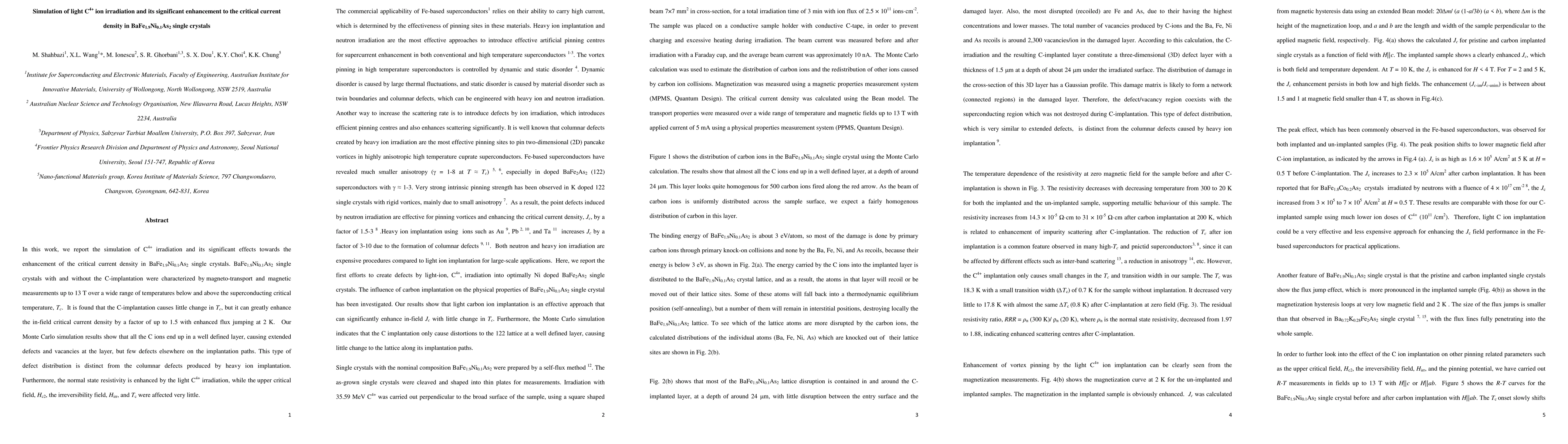 This study simulates the effects of C4+ ion irradiation on BaFe1.9Ni0.1As2 single crystals, finding that it significantly enhances the critical current density without altering the superconducting critical temperature. The irradiation results in extended defects in a specific layer, boosting the in-field critical current density by up to 1.5 times.