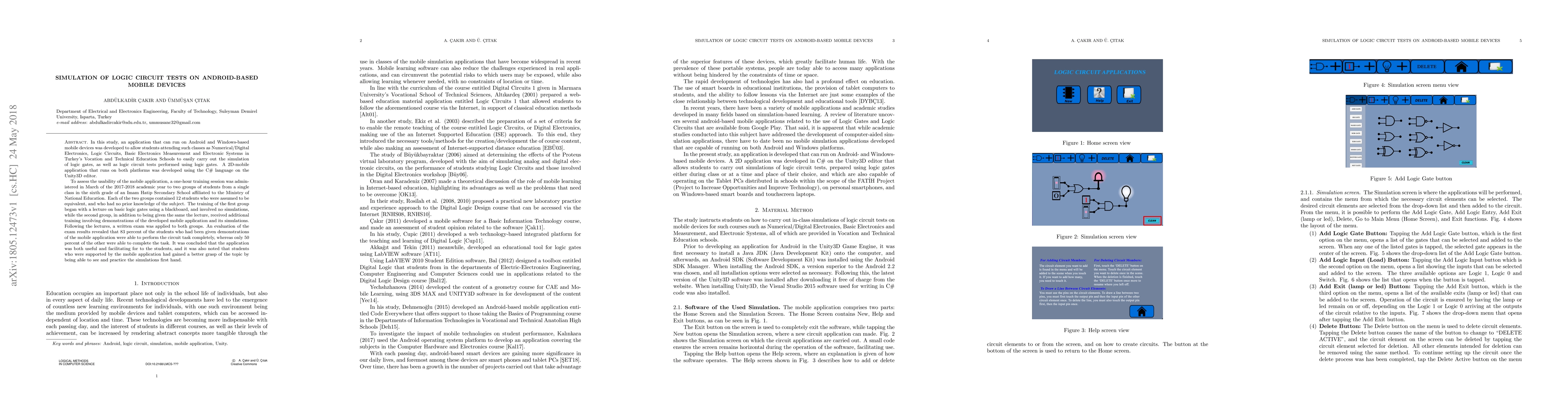 In this study, an application that can run on Android and Windows-based mobile devices was developed to allow students attending such classes as Numerical/Digital Electronics, Logic Circuits, Basic Electronics Measurement and Electronic Systems in Turkey's Vocation and Technical Education Schools to easily carry out the simulation of logic gates, as well as logic circuit tests performed using logic gates. A 2D-mobile application that runs on both platforms was developed using the C# language on the Unity3D editor. To assess the usability of the mobile application, a one-hour training session was administered in March of the 2017-2018 academic year to two groups of students from a single class in the sixth grade of an Imam Hatip Secondary School affiliated to the Ministry of National Education. Each of the two groups contained 12 students who were assumed to be equivalent, and who had no prior knowledge of the subject. The training of the first group began with a lecture on basic logic gates using a blackboard, and involved no simulations, while the second group, in addition to being given the same the lecture, received additional training involving demonstrations of the developed mobile application and its simulations. Following the lectures, a written exam was applied to both groups. An evaluation of the exam results revealed that 83 percent of the students who had been given demonstrations of the mobile application were able to perform the circuit task completely, whereas only 50 percent of the other were able to complete the task. It was concluded that the application was both useful and facilitating for to the students, and it was also noted that students who were supported by the mobile application had gained a better grasp of the topic by being able to see and practice the simulations first hand.