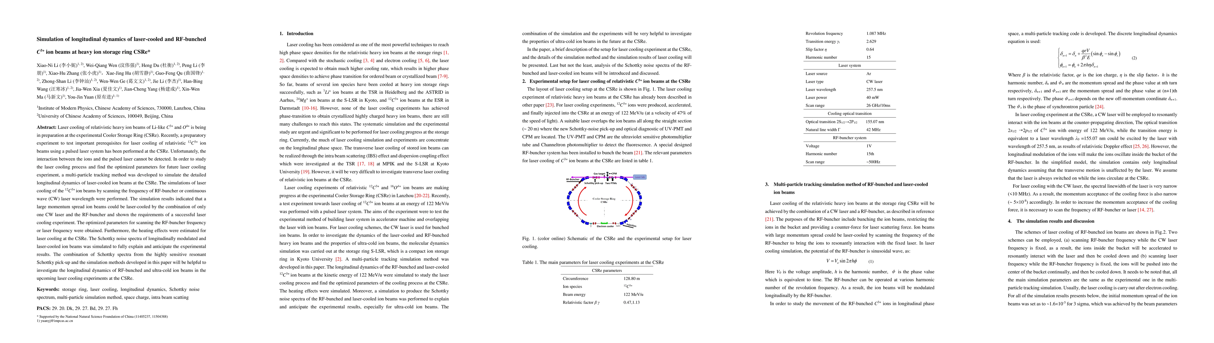 Laser cooling of relativistic heavy ion beams of Li-like C$^{3+}$ and O$^{4+}$ is being in preparation at the experimental Cooler Storage Ring (CSRe). Recently, a preparatory experiment to test important prerequisites for laser cooling of relativistic $^{12}$C$^{3+}$ ion beams using a pulsed laser system has been performed at the CSRe. Unfortunately, the interaction between the ions and the pulsed laser cannot be detected. In order to study the laser cooling process and find the optimized parameters for future laser cooling experiment, a multi-particle tracking method was developed to simulate the detailed longitudinal dynamics of laser-cooled ion beams at the CSRe. The simulations of laser cooling of the $^{12}$C$^{3+}$ ion beams by scanning the frequency of RF-buncher or continuous wave (CW) laser wavelength were performed. The simulation results indicated that a large momentum spread ion beams could be laser-cooled by the combination of only one CW laser and the RF-buncher and shown the requirements of a successful laser cooling experiment. The optimized parameters for scanning the RF-buncher frequency or laser frequency were obtained. Furthermore, the heating effects were estimated for laser cooling at the CSRe. The Schottky noise spectra of longitudinally modulated and laser-cooled ion beams was simulated to fully explain and anticipate the experimental results. The combination of Schottky spectra from the highly sensitive resonant Schottky pick-up and the simulation methods developed in this paper will be helpful to investigate the longitudinal dynamics of RF-bunched and ultra-cold ion beams in the upcoming laser cooling experiments at the CSRe.