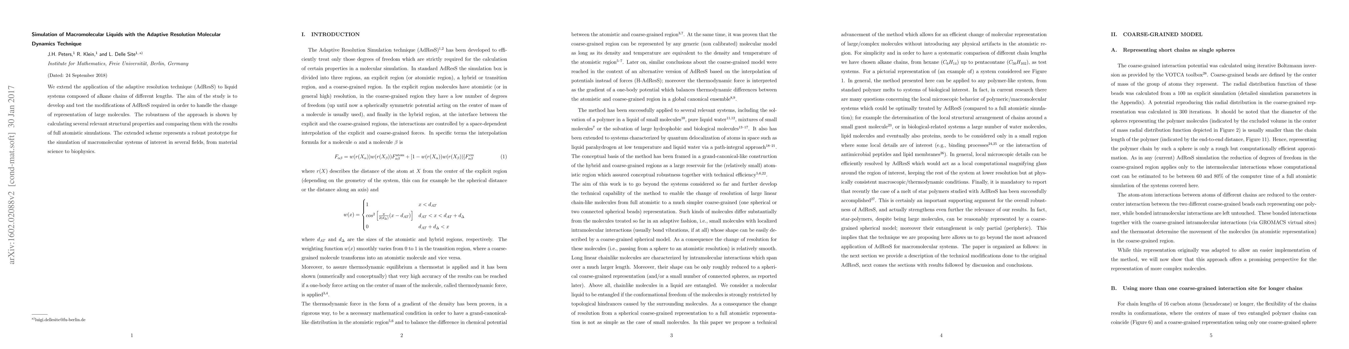 This research extends the Adaptive Resolution Molecular Dynamics (AdResS) technique to simulate liquid systems of alkane chains with varying lengths. The study successfully demonstrates the method's robustness by comparing calculated structural properties with full atomistic simulation results, proposing a prototype for simulating macromolecular systems in fields like material science and biophysics.