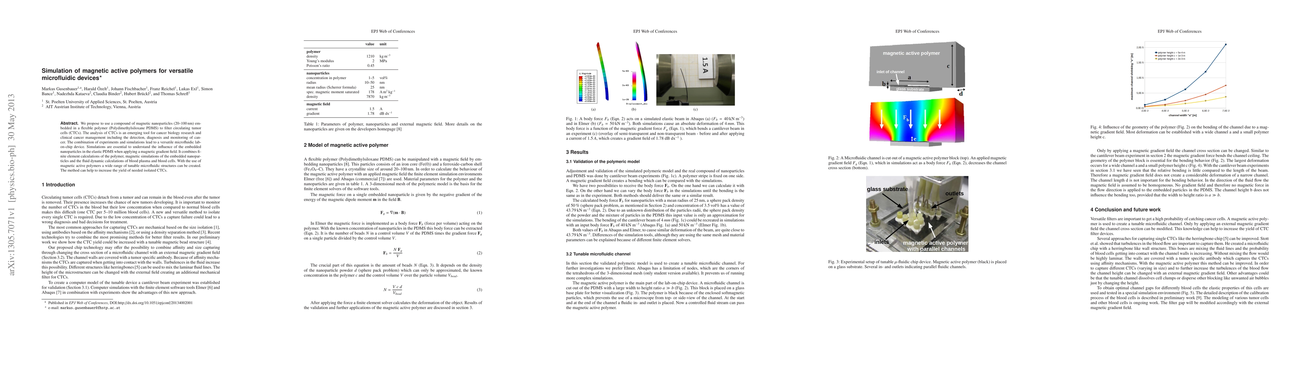 We propose to use a compound of magnetic nanoparticles (20-100 nm) embedded in a flexible polymer (Polydimethylsiloxane PDMS) to filter circulating tumor cells (CTCs). The analysis of CTCs is an emerging tool for cancer biology research and clinical cancer management including the detection, diagnosis and monitoring of cancer. The combination of experiments and simulations lead to a versatile microfluidic lab-on-chip device. Simulations are essential to understand the influence of the embedded nanoparticles in the elastic PDMS when applying a magnetic gradient field. It combines finite element calculations of the polymer, magnetic simulations of the embedded nanoparticles and the fluid dynamic calculations of blood plasma and blood cells. With the use of magnetic active polymers a wide range of tunable microfluidic structures can be created. The method can help to increase the yield of needed isolated CTCs.