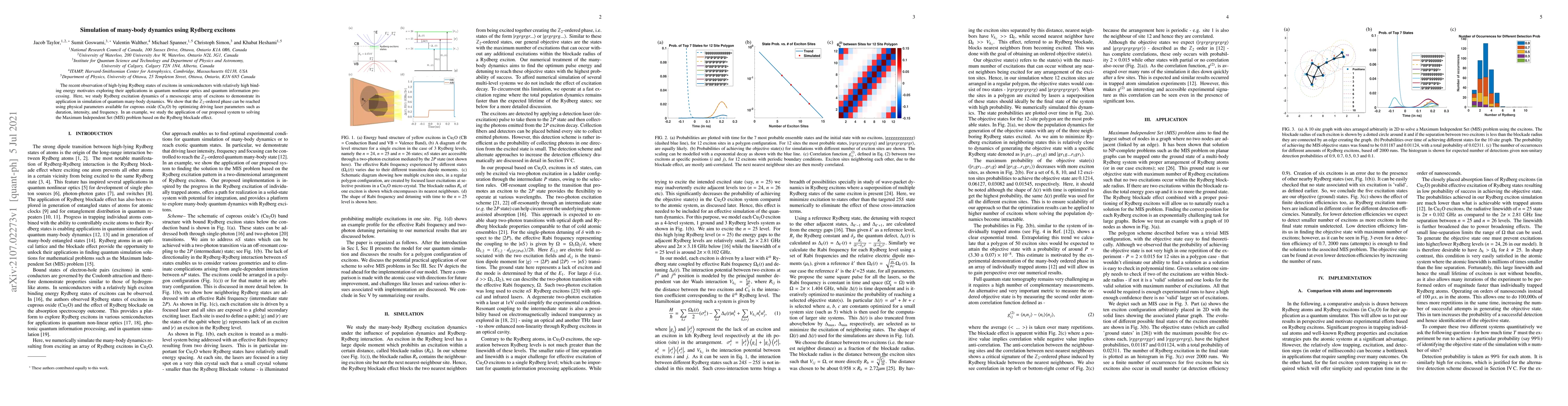 The recent observation of high-lying Rydberg states of excitons in semiconductors with relatively high binding energy motivates exploring their applications in quantum nonlinear optics and quantum information processing. Here, we study Rydberg excitation dynamics of a mesoscopic array of excitons to demonstrate its application in simulation of quantum many-body dynamics. We show that the $\mathbb{Z}_2$-ordered phase can be reached using physical parameters available for cuprous oxide (Cu$_2$O) by optimizing driving laser parameters such as duration, intensity, and frequency. In an example, we study the application of our proposed system to solving the Maximum Independent Set (MIS) problem based on the Rydberg blockade effect.