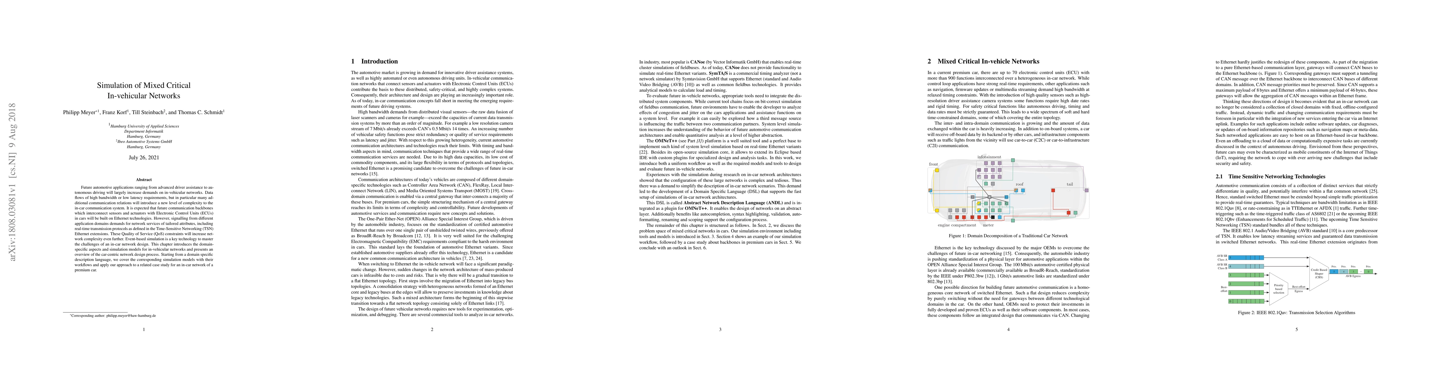 Future automotive applications ranging from advanced driver assistance to autonomous driving will largely increase demands on in-vehicular networks. Data flows of high bandwidth or low latency requirements, but in particular many additional communication relations will introduce a new level of complexity to the in-car communication system. It is expected that future communication backbones which interconnect sensors and actuators with ECU in cars will be built on Ethernet technologies. However, signalling from different application domains demands for network services of tailored attributes, including real-time transmission protocols as defined in the TSN Ethernet extensions. These QoS constraints will increase network complexity even further. Event-based simulation is a key technology to master the challenges of an in-car network design. This chapter introduces the domain-specific aspects and simulation models for in-vehicular networks and presents an overview of the car-centric network design process. Starting from a domain specific description language, we cover the corresponding simulation models with their workflows and apply our approach to a related case study for an in-car network of a premium car.