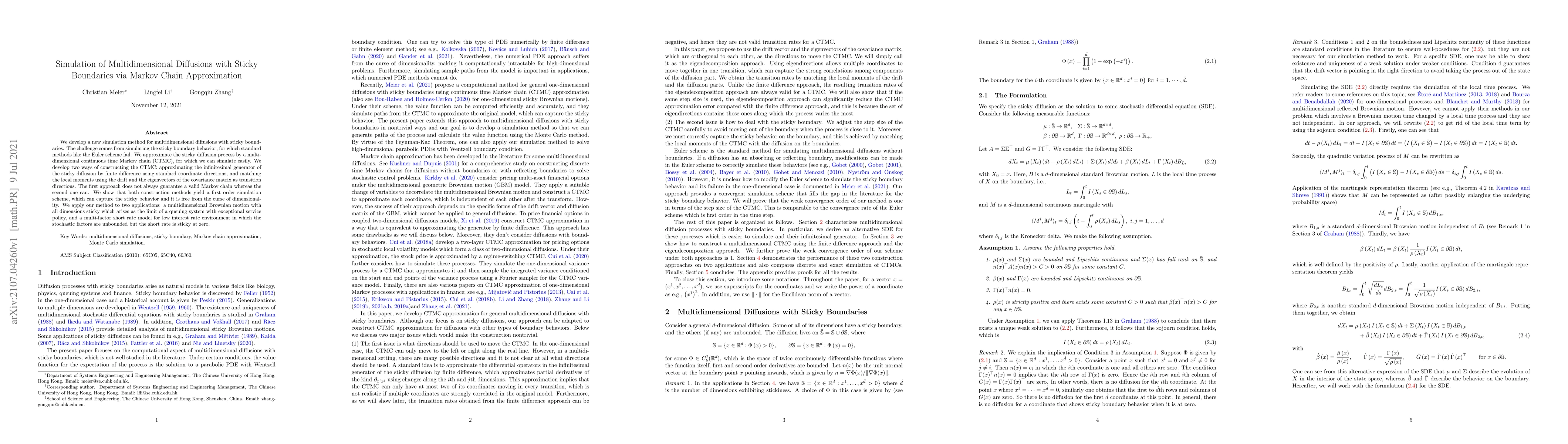 This paper introduces a new simulation method for multidimensional diffusions with sticky boundaries using a continuous time Markov chain (CTMC) approximation. It presents two CTMC construction methods, one based on finite differences and another on local moments, and demonstrates their effectiveness in capturing sticky boundary behavior without succumbing to the curse of dimensionality.