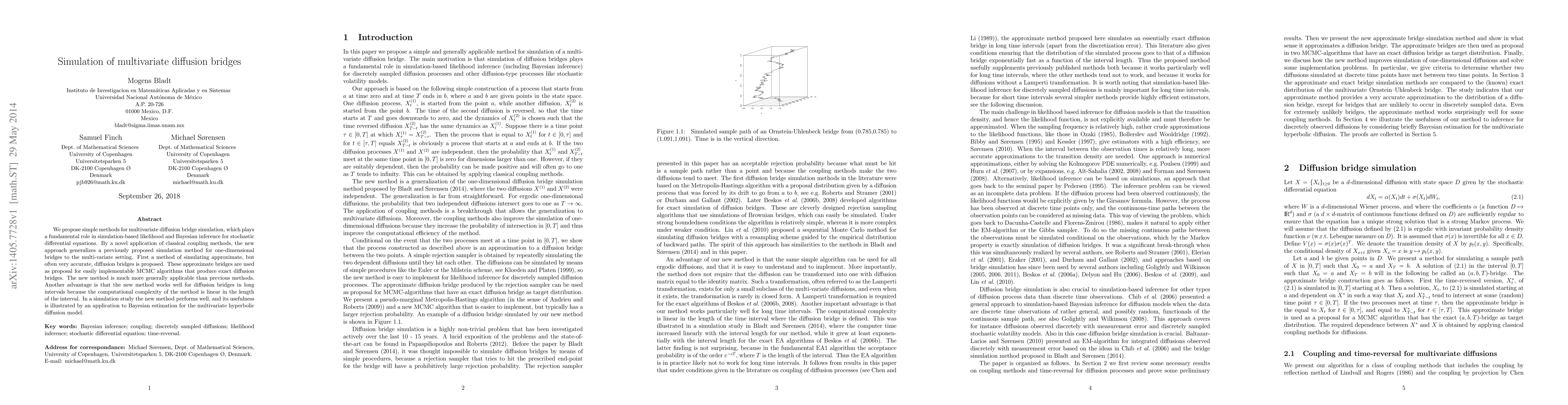 This paper proposes a novel simulation method for multivariate diffusion bridges, extending classical coupling techniques to the multivariate setting. The new approach enables efficient MCMC algorithms for exact diffusion bridge simulation, demonstrating good performance in long intervals and successful application to Bayesian estimation for the multivariate hyperbolic diffusion model.
