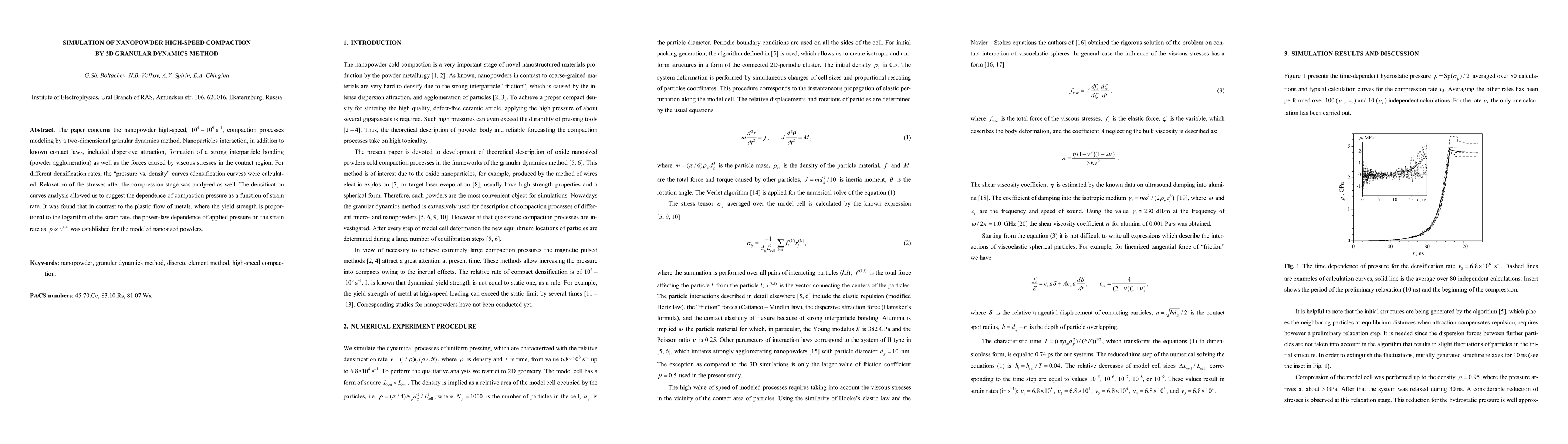 Researchers developed a 2D granular dynamics method to simulate high-speed nanopowder compaction, revealing that the pressure required to compact nanosized powders increases with strain rate according to a power-law dependence of $p o v^{1/4}$.