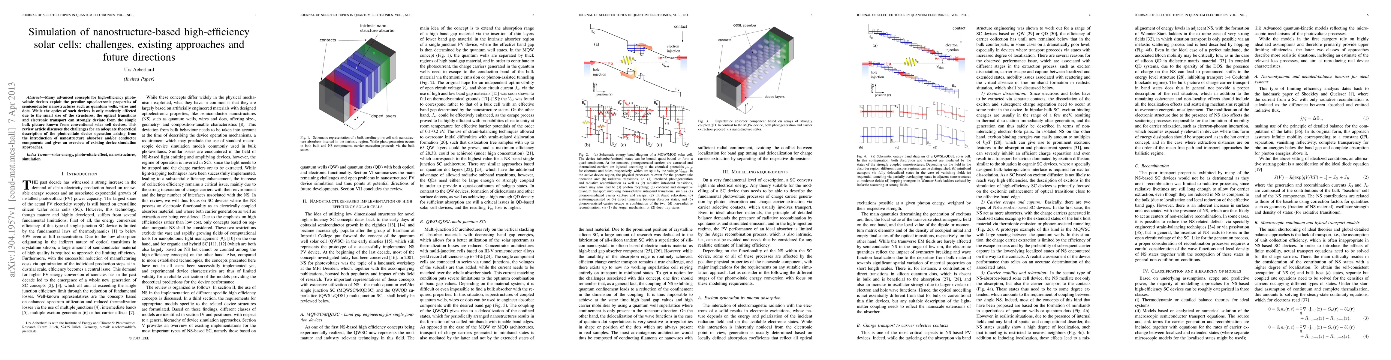 This paper reviews the challenges in simulating high-efficiency solar cells based on nanostructures, highlighting the deviations in optical transitions and electronic transport from conventional bulk devices, and provides an overview of current simulation approaches. Future directions for improving these simulations are also discussed.