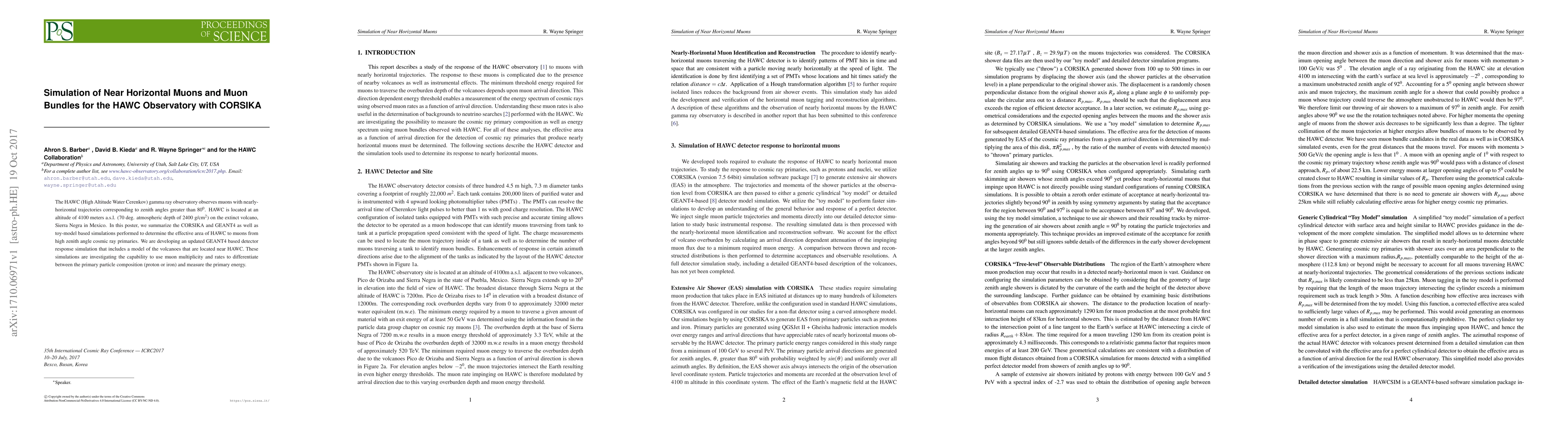 The HAWC (High Altitude Water Cerenkov) gamma ray observatory observes muons with nearly-horizontal trajectories corresponding to zenith angles greater than $80^{0}$. HAWC is located at an altitude of 4100 meters a.s.l. (70 deg. atmospheric depth of 2400 g/cm$^{2}$) on the extinct volcano, Sierra Negra in Mexico. In this poster, we summarize the CORSIKA and GEANT4 as well as toy-model based simulations performed to determine the effective area of HAWC to muons from high zenith angle cosmic ray primaries. We are developing an updated GEANT4 based detector response simulation that includes a model of the volcanoes that are located near HAWC. These simulations are investigating the capability to use muon multiplicity and rates to differentiate between the primary particle composition (proton or iron) and measure the primary energy.