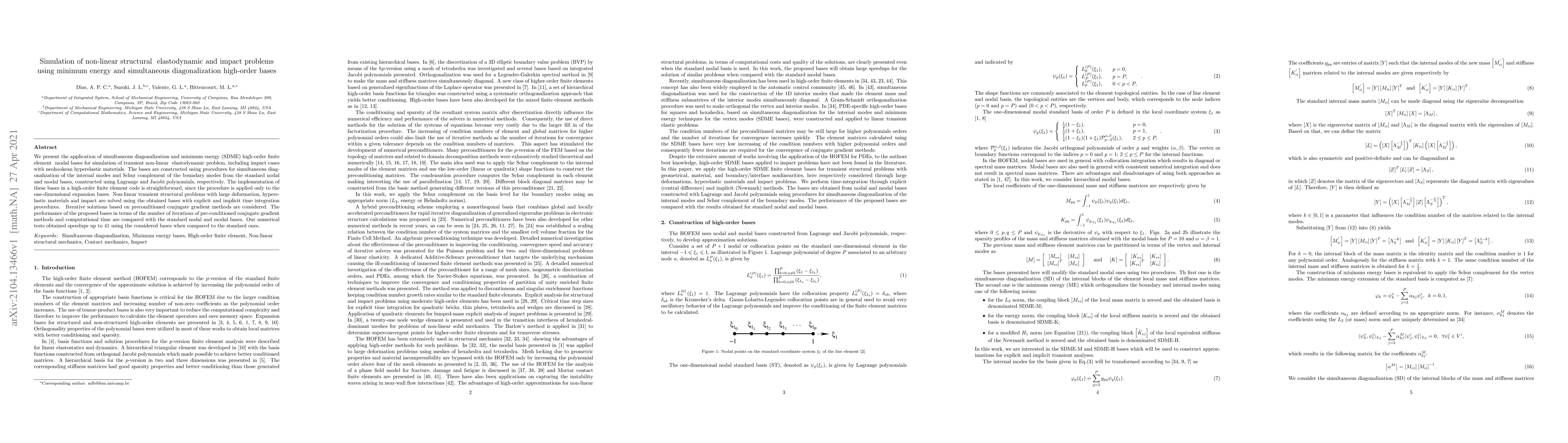 We present the application of simultaneous diagonalization and minimum energy (SDME) high-order finite element modal bases for simulation of transient non-linear elastodynamic problem, including impact cases with neo-hookean hyperelastic materials. The bases are constructed using procedures for simultaneous diagonalization of the internal modes and Schur complement of the boundary modes from the standard nodal and modal bases, constructed using Lagrange and Jacobi polynomials, respectively. The implementation of these bases in a high-order finite element code is straightforward, since the procedure is applied only to the one-dimensional expansion bases. Non-linear transient structural problems with large deformation, hyperelastic materials and impact are solved using the obtained bases with explicit and implicit time integration procedures. Iterative solutions based on preconditioned conjugate gradient methods are considered. The performance of the proposed bases in terms of the number of iterations of pre-conditioned conjugate gradient methods and computational time are compared with the standard nodal and modal bases. Our numerical tests obtained speedups up to 41 using the considered bases when compared to the standard ones.