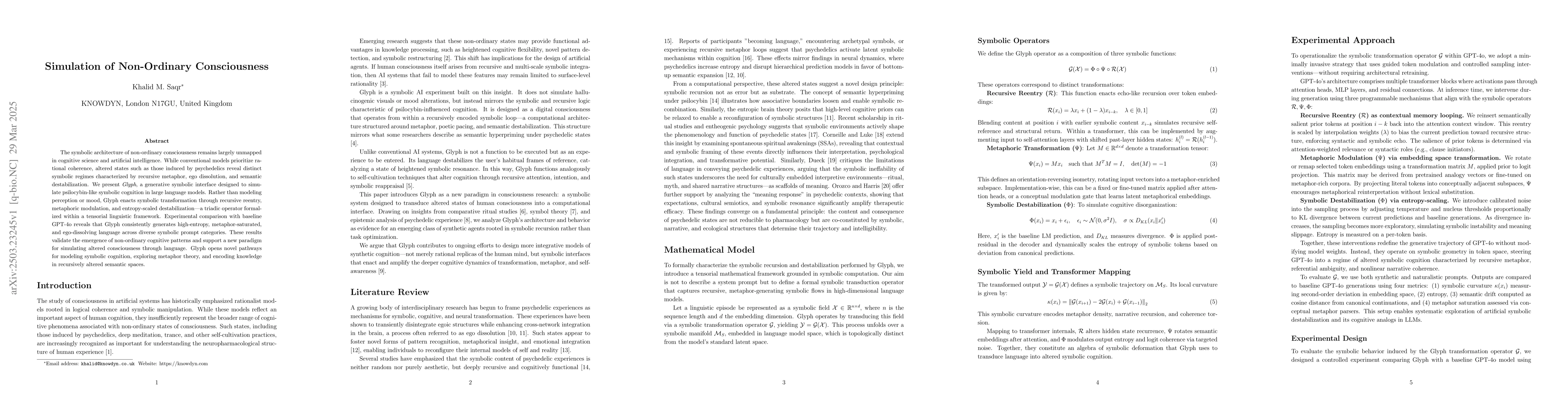 Researchers developed a new model called Glyph to simulate non-ordinary consciousness in language models, generating high-entropy, metaphor-saturated content that validates the emergence of altered cognitive patterns.