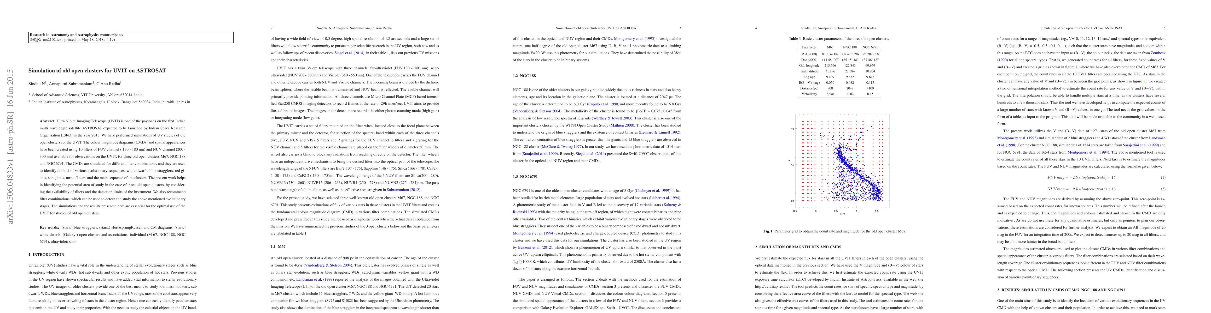 Ultra Violet Imaging Telescope (UVIT) is one of the payloads on the first Indian multi wavelength satellite ASTROSAT expected to be launched by Indian Space Research Organisation (ISRO) in the year 2015. We have performed simulations of UV studies of old open clusters for the UVIT. The colour magnitude diagrams (CMDs) and spatial appearances have been created using 10 filters of FUV channel (130 - 180 nm) and NUV channel (200 - 300nm) available for observations on the UVIT, for three old open clusters M67, NGC 188 and NGC 6791. The CMDs are simulated for different filter combinations, and they are used to identify the loci of various evolutionary sequences, white dwarfs, blue stragglers, red giants, sub giants, turn off stars and the main sequence of the clusters. The present work helps in identifying the potential area of study in the case of three old open clusters, by considering the availability of filters and the detection limits of the instrument. We also recommend filter combinations, which can be used to detect and study the above mentioned evolutionary stages. The simulations and the results presented here are essential for the optimal use of the UVIT for studies of old open clusters.