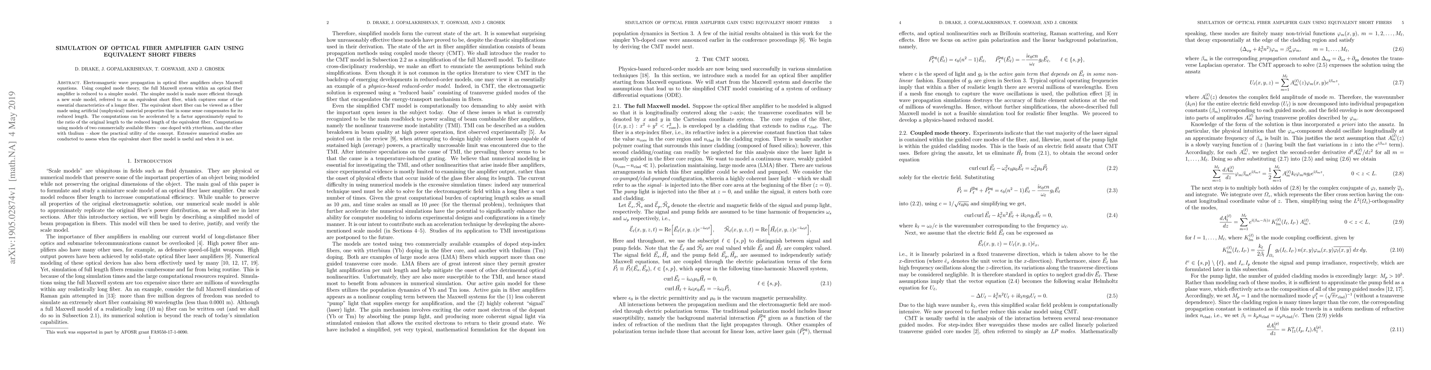 Researchers developed an equivalent short fiber model to simulate optical fiber amplifier gain, reducing computational time by a factor related to the original length, with promising results for doped fibers used in commercial applications.