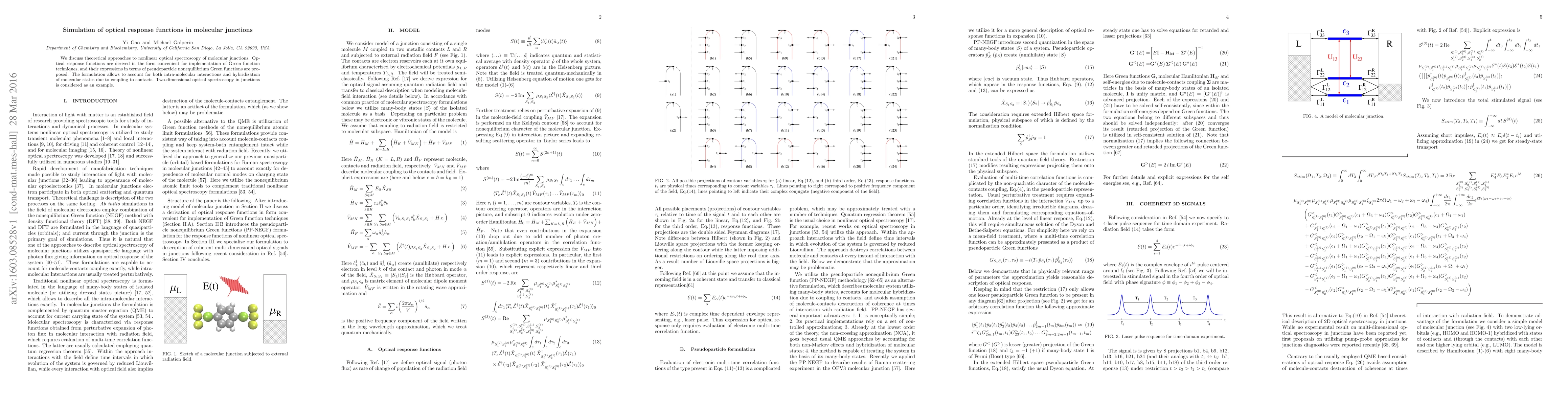 This paper presents theoretical approaches for nonlinear optical spectroscopy in molecular junctions, deriving optical response functions suitable for Green function techniques and considering intra-molecular interactions and state hybridization due to contact coupling, exemplified by two-dimensional optical spectroscopy.
