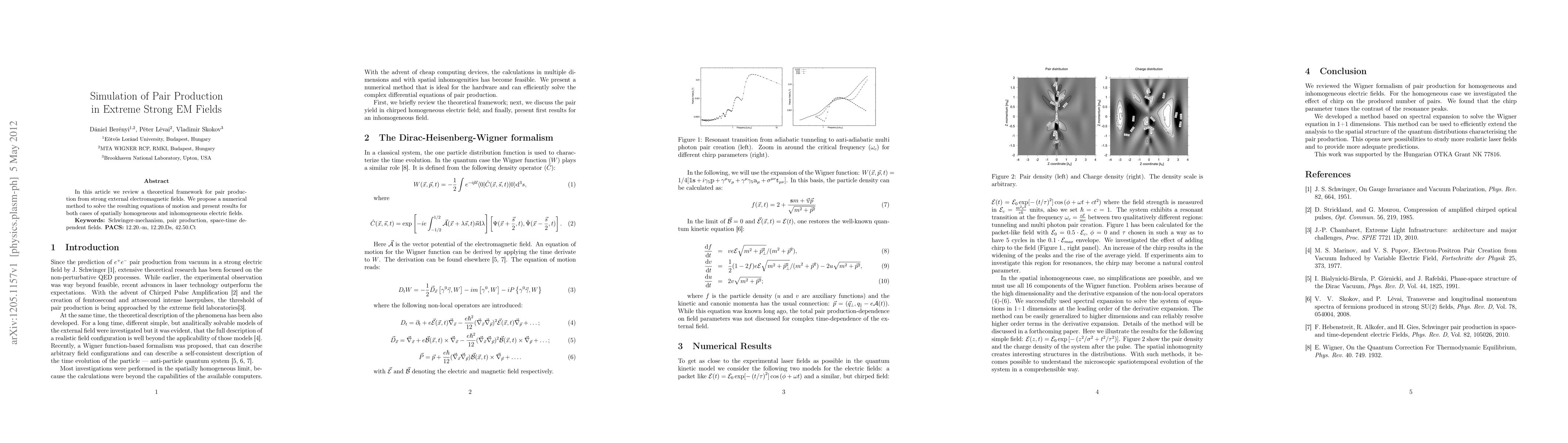 This paper reviews a theoretical framework for pair production in strong electromagnetic fields and proposes a numerical method to solve the equations of motion, presenting results for both homogeneous and inhomogeneous electric fields.