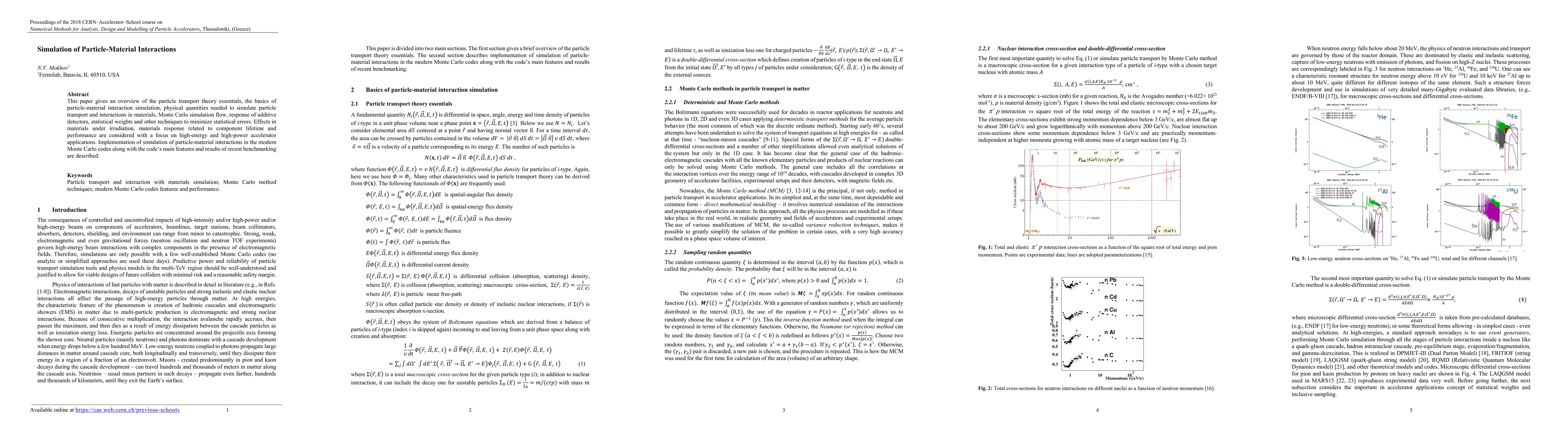 This paper gives an overview of the particle transport theory essentials, the basics of particle-material interaction simulation, physical quantities needed to simulate particle transport and interactions in materials, Monte Carlo simulation flow, response of additive detectors, statistical weights and other techniques to minimize statistical errors. Effects in materials under irradiation, materials response related to component lifetime and performance are considered with a focus on high-energy and high-power accelerator applications. Implementation of simulation of particle-material interactions in the modern Monte Carlo codes along with the code s main features and results of recent benchmarking are described.