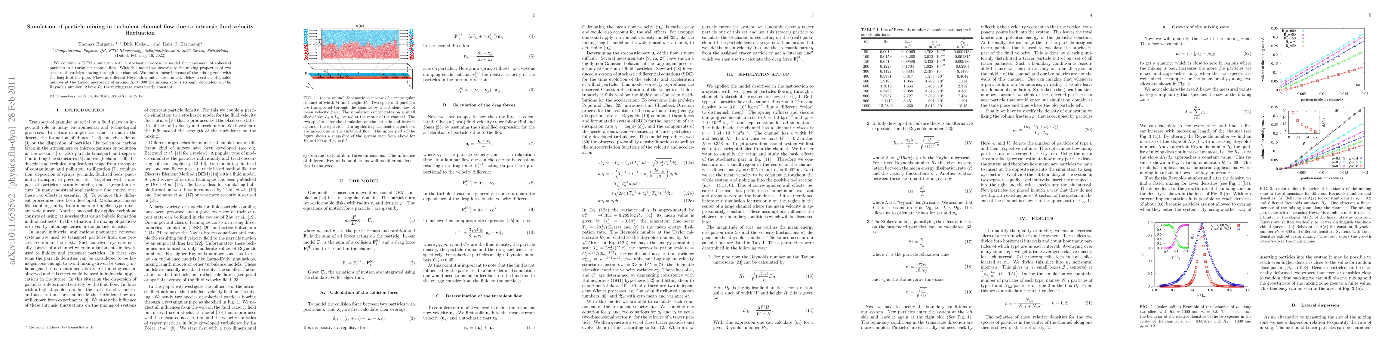 We combine a DEM simulation with a stochastic process to model the movement of spherical particles in a turbulent channel flow. With this model we investigate the mixing properties of two species of particles flowing through the channel. We find a linear increase of the mixing zone with the length of the pipe. Flows at different Reynolds number are studied. Below a critical Reynolds number at the Taylor microscale of around $R_{c} \approx 300$ the mixing rate is strongly dependent on the Reynolds number. Above $R_{c}$ the mixing rate stays nearly constant.