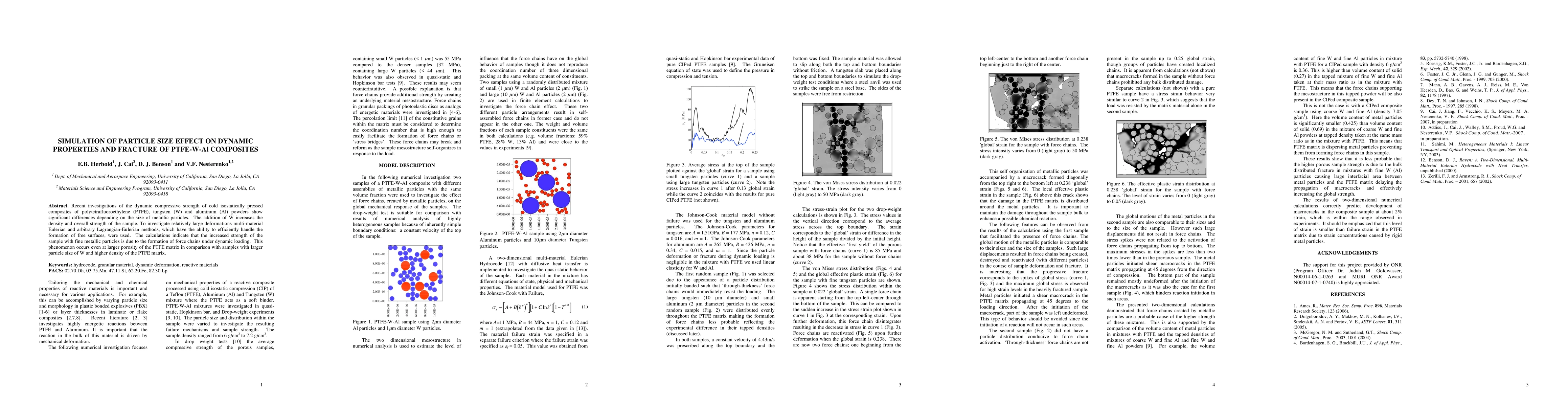 Recent investigations of the dynamic compressive strength of cold isostatically pressed composites of polytetrafluoroethylene (PTFE), tungsten (W) and aluminum (Al) powders show significant differences depending on the size of metallic particles. The addition of W increases the density and overall strength of the sample. To investigate relatively large deformations multi-material Eulerian and arbitrary Lagrangian-Eulerian methods, which have the ability to efficiently handle the formation of free surfaces, were used. The calculations indicate that the increased strength of the sample with fine metallic particles is due to the formation of force chains under dynamic loading. This phenomenon occurs even at larger porosity of the PTFE matrix in comparison with samples with larger particle size of W and higher density of the PTFE matrix.