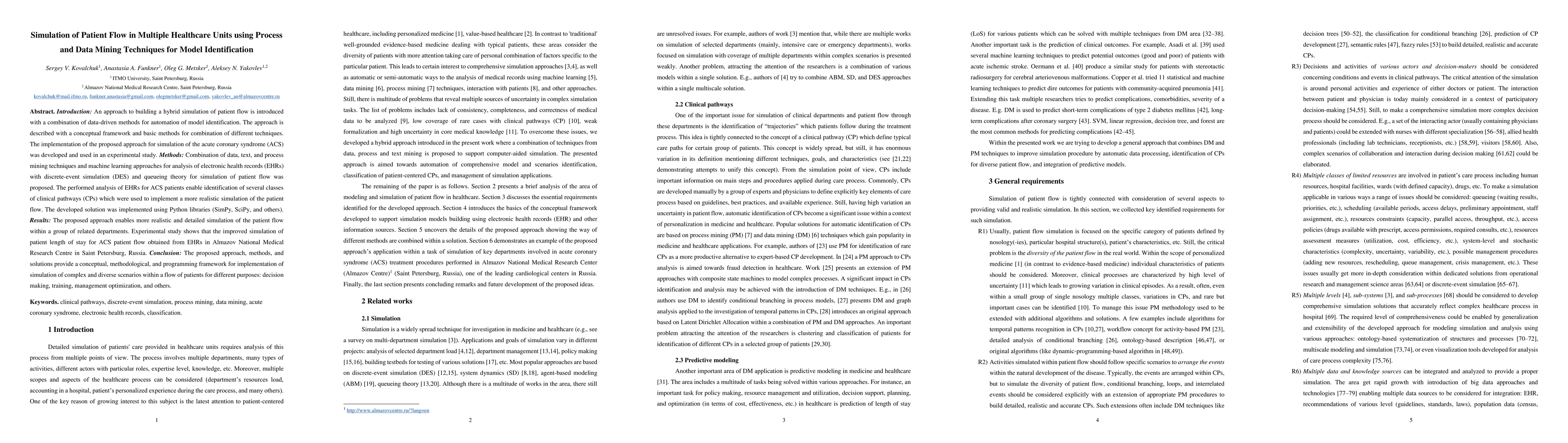 This paper proposes a hybrid simulation approach combining data mining and process mining techniques to model patient flow in healthcare units, specifically for acute coronary syndrome patients. The method uses electronic health records and discrete-event simulation to identify clinical pathways, resulting in a more realistic simulation of patient flow and length of stay.