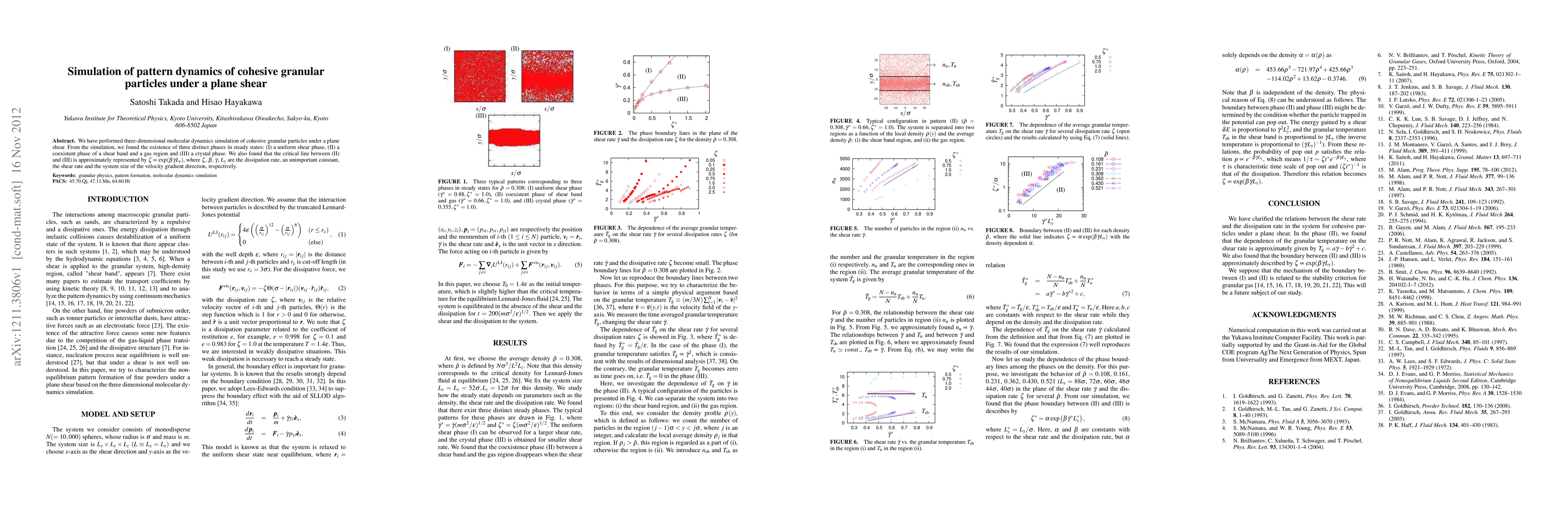This paper simulates three-dimensional dynamics of cohesive granular particles under plane shear, identifying three steady-state phases: uniform shear, a coexistent shear band and gas region, and a crystal phase. The critical transition between the coexistent and crystal phases is modeled by $\zeta \propto \exp(\beta \dot\gamma L_y)$.