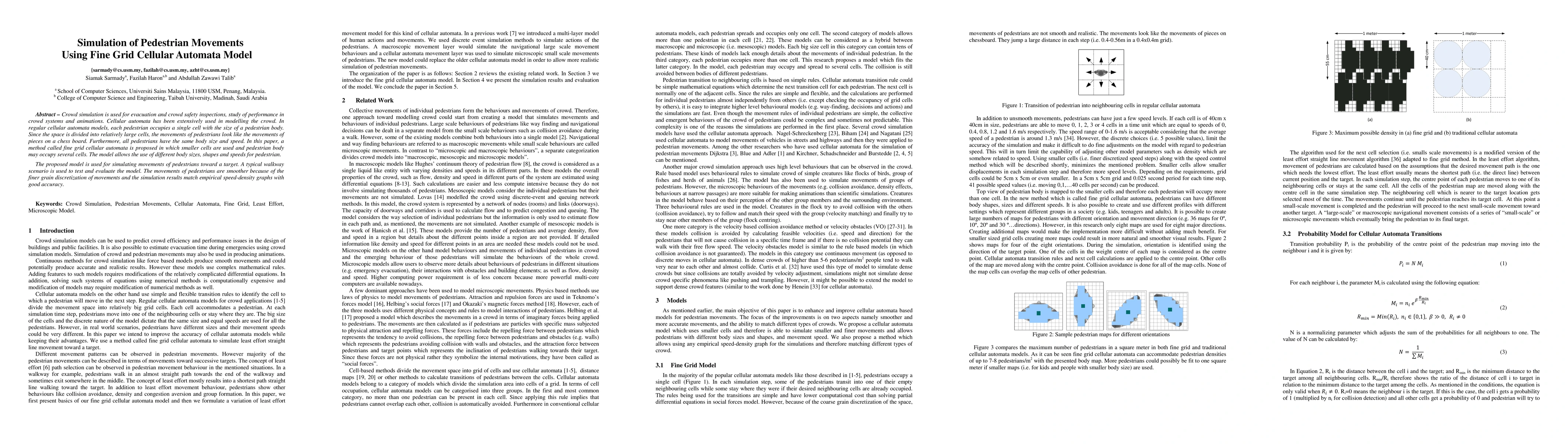 This paper proposes a fine grid cellular automata model for simulating pedestrian movements, allowing for different body sizes, shapes, and speeds. The model's finer discretization results in smoother and more accurate pedestrian movements compared to traditional cellular automata, as demonstrated in a typical walkway scenario.