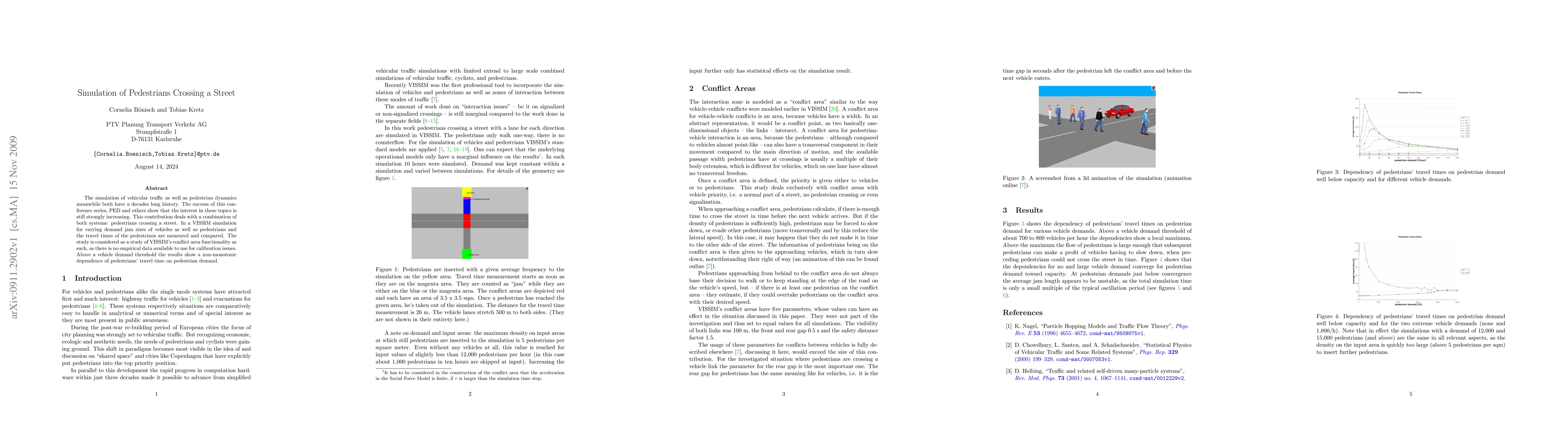 The simulation of vehicular traffic as well as pedestrian dynamics meanwhile both have a decades long history. The success of this conference series, PED and others show that the interest in these topics is still strongly increasing. This contribution deals with a combination of both systems: pedestrians crossing a street. In a VISSIM simulation for varying demand jam sizes of vehicles as well as pedestrians and the travel times of the pedestrians are measured and compared. The study is considered as a study of VISSIM's con ict area functionality as such, as there is no empirical data available to use for calibration issues. Above a vehicle demand threshold the results show a non-monotonic dependence of pedestrians' travel time on pedestrian demand.