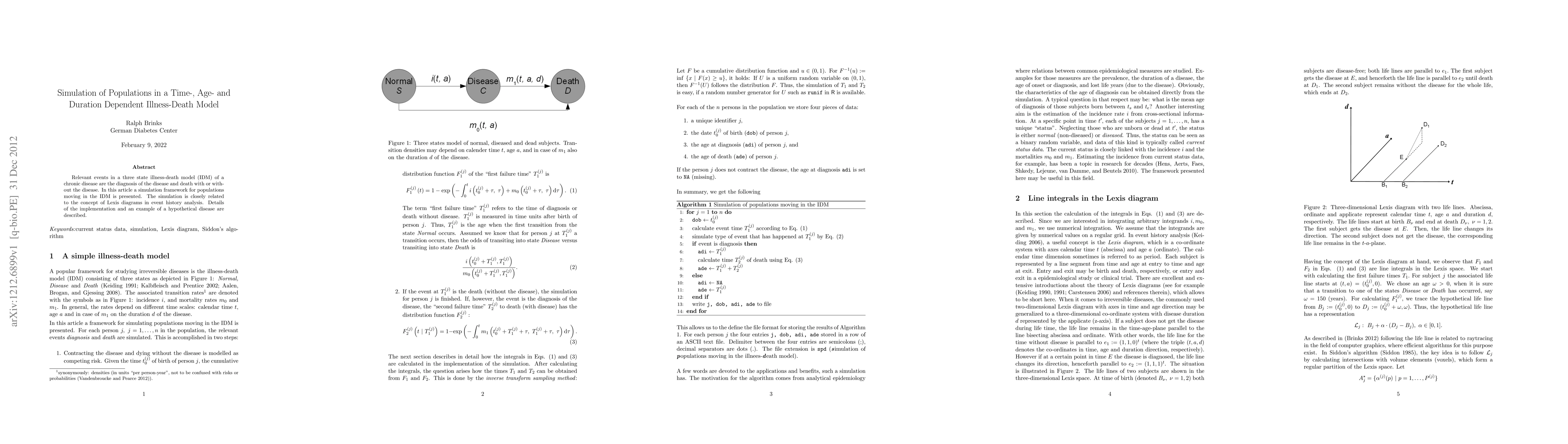 Relevant events in a three state illness-death model (IDM) of a chronic disease are the diagnosis of the disease and death with or without the disease. In this article a simulation framework for populations moving in the IDM is presented. The simulation is closely related to the concept of Lexis diagrams in event history analysis. Details of the implementation and an example of a hypothetical disease are described.